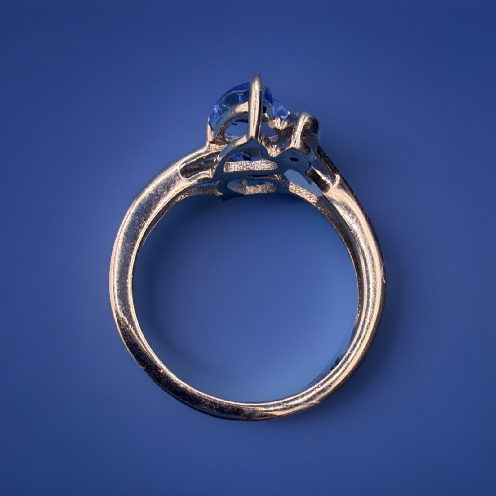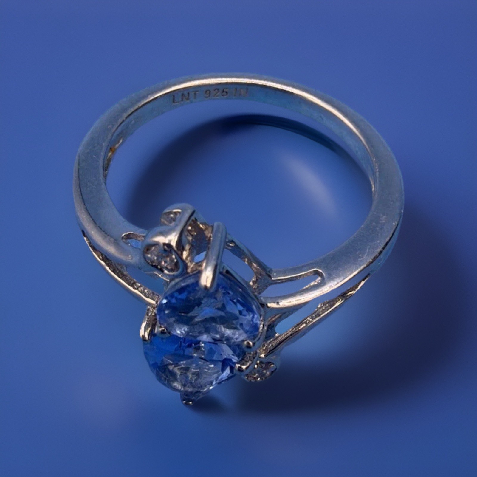 как выглядит 925 Sterling Silver Ring Blue Heart Gemstones w/ Clear Accent Stones Split Shank фото