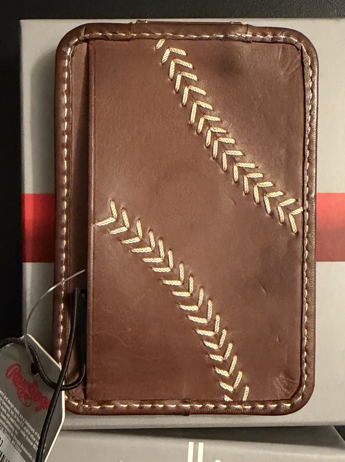 как выглядит Rawlings Brown Leather Baseball Stitch Front Pocket/Clip Magnetic Wallet - RFID фото