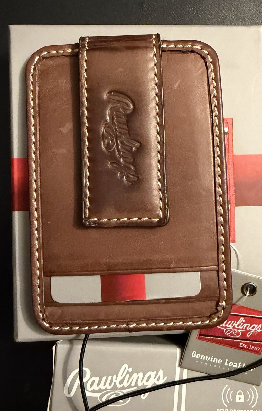 Rawlings Brown Leather Baseball Stitch Front Pocket/Clip Magnetic Wallet - RFID