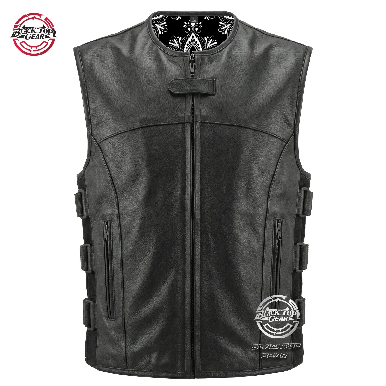 Men Black Leather vest with zipper Stripped SWAT style Motorcycle club Vest