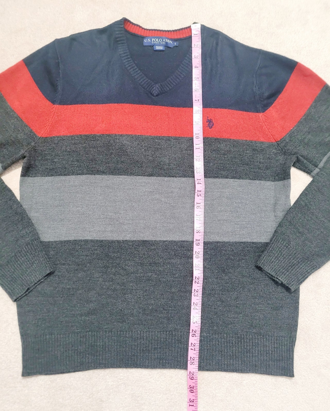 как выглядит U.S. Polo Assn Men s V-Neck Sweater Size Large Gray Red Striped Long Sleeve фото