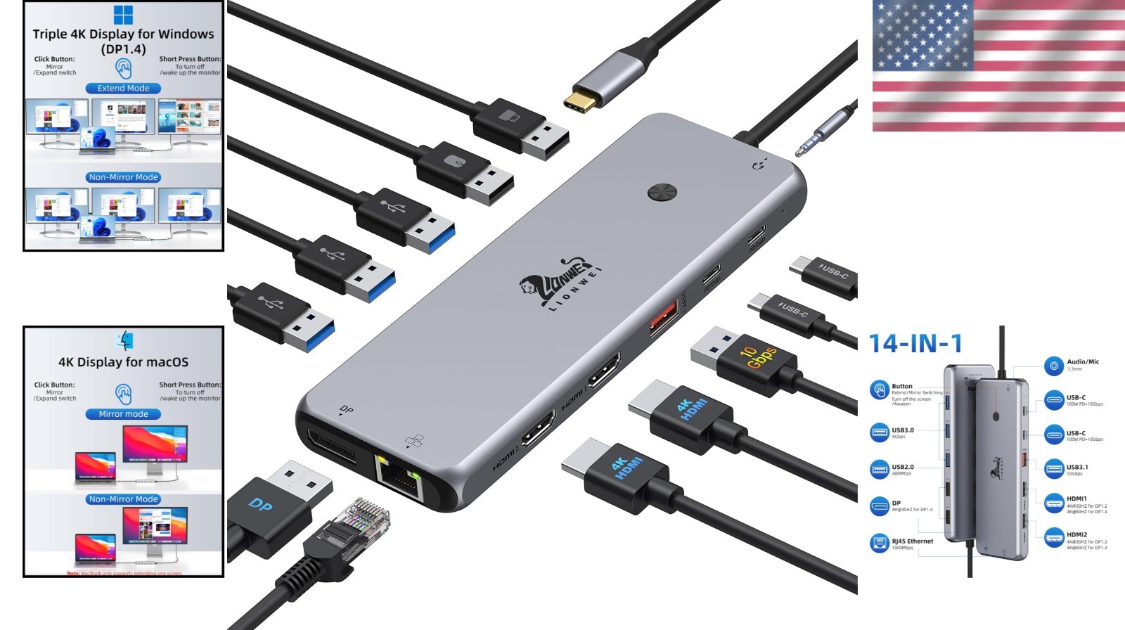 USB C Docking Station for MacBook, Dell, HP - Triple Display