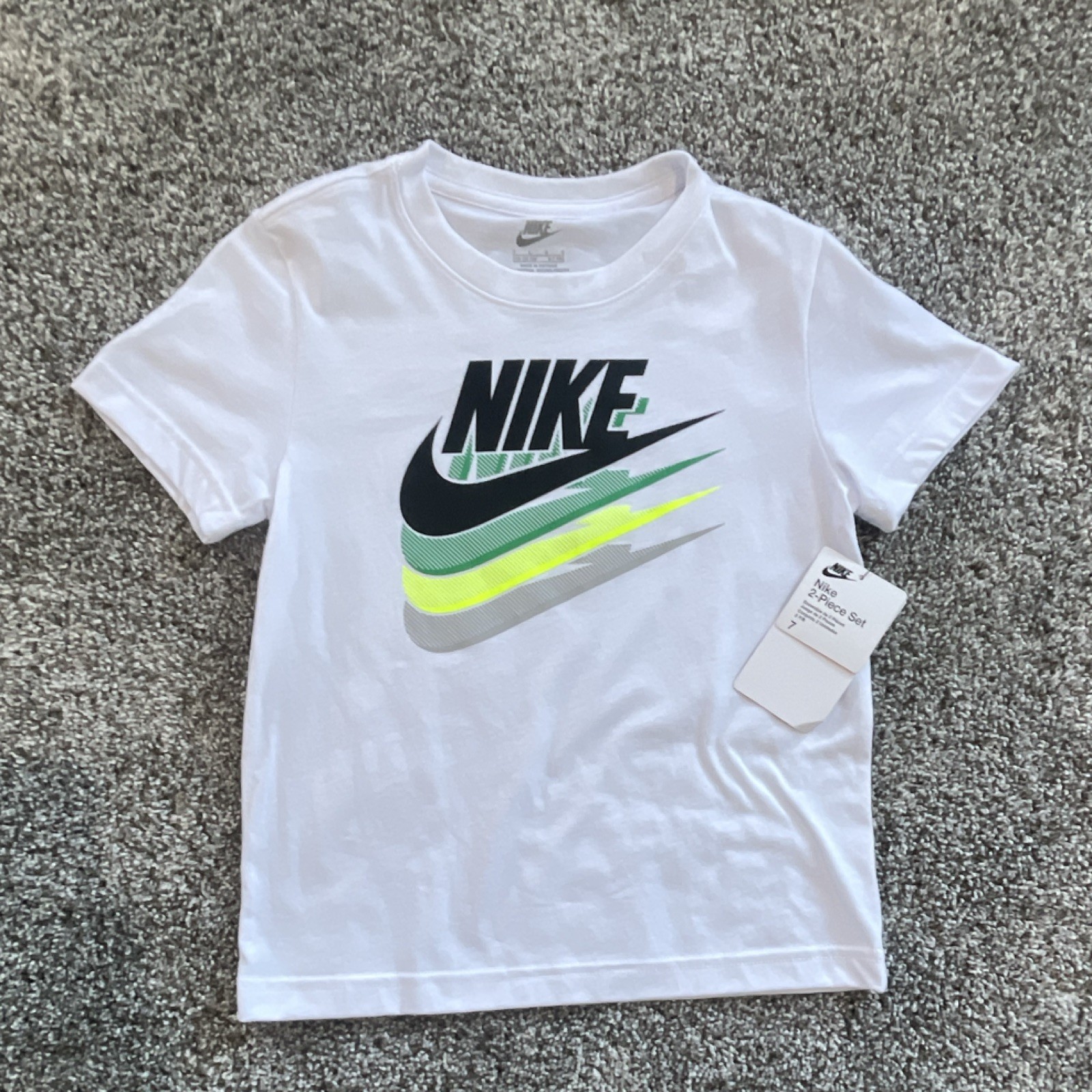 NWT. NIKE STADIUM GREEN WHITE 2-PIECE T-SHIRT AND SHORTS SET. SIZE 7. BOYS.