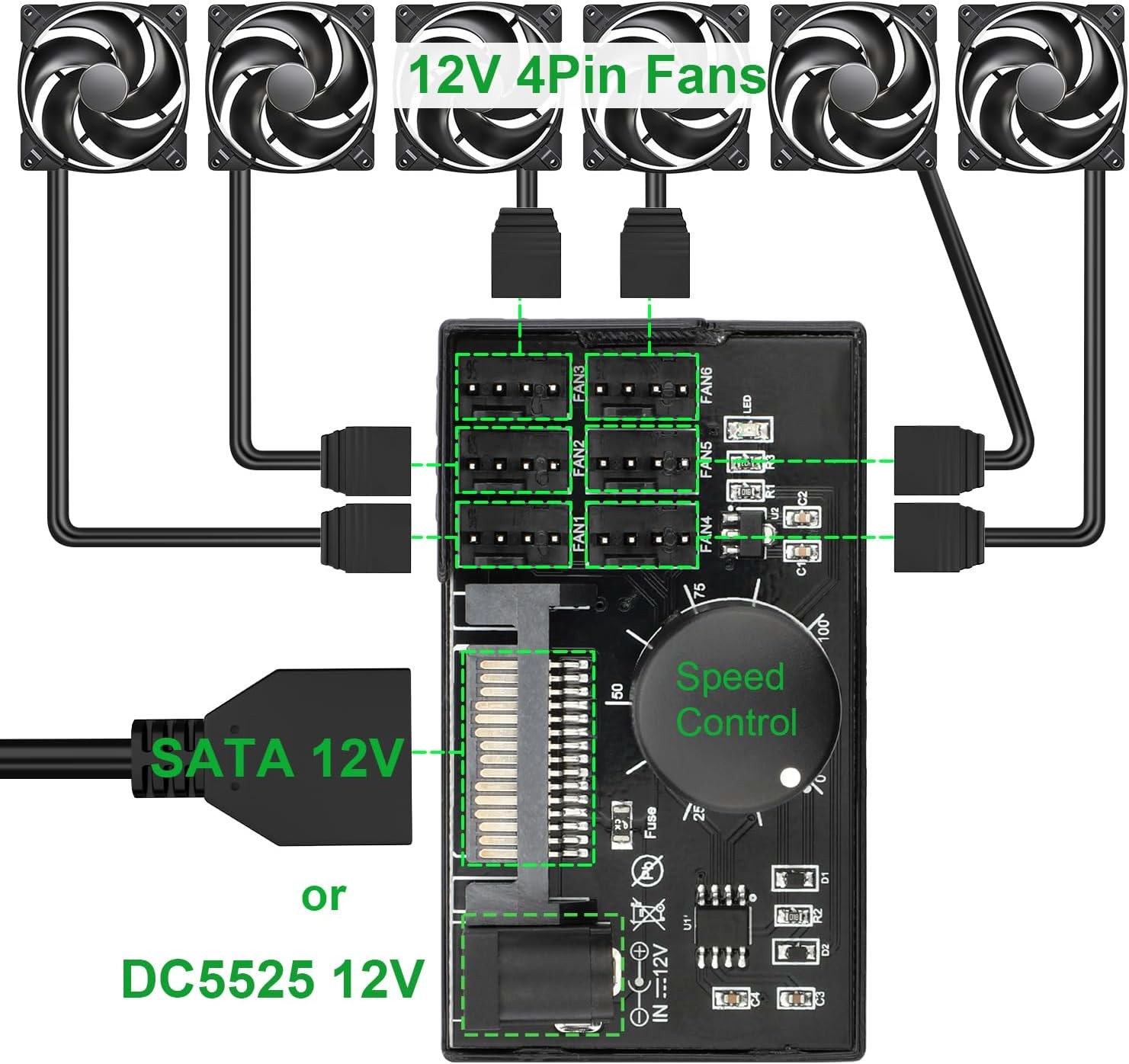 4 Pin 12V PWM Fan Controller 6 Fans Supported , PC Adapter Hub Black