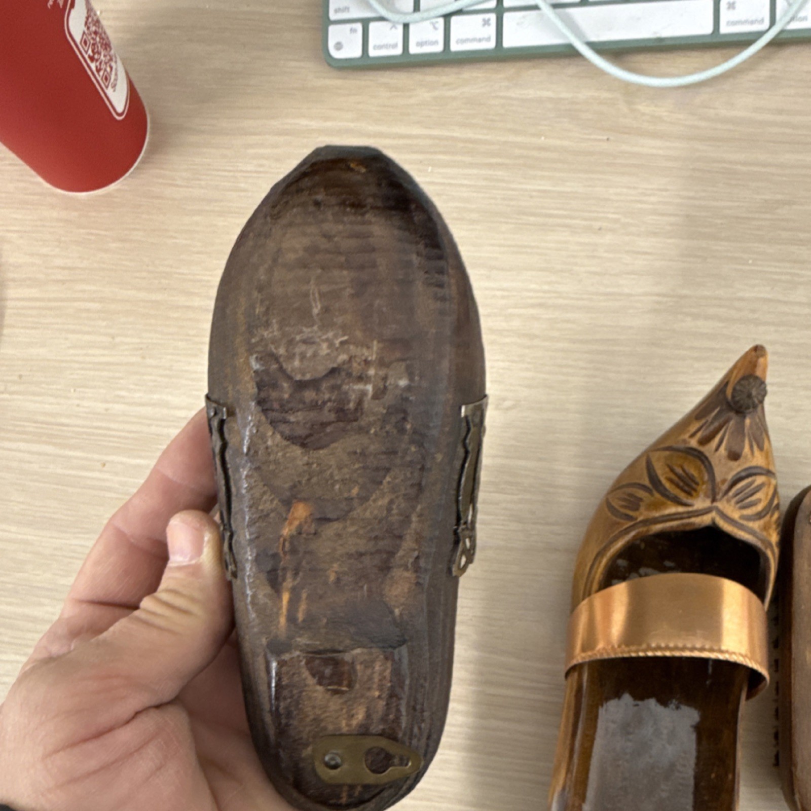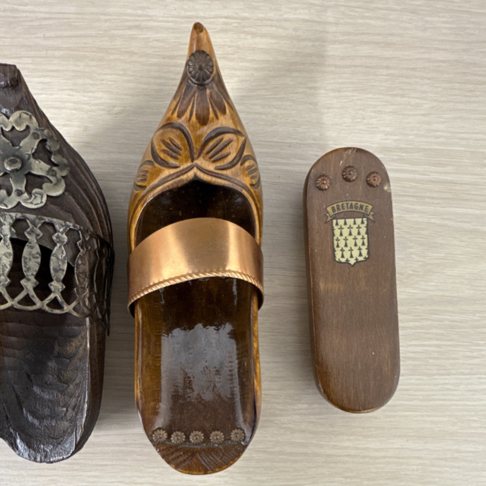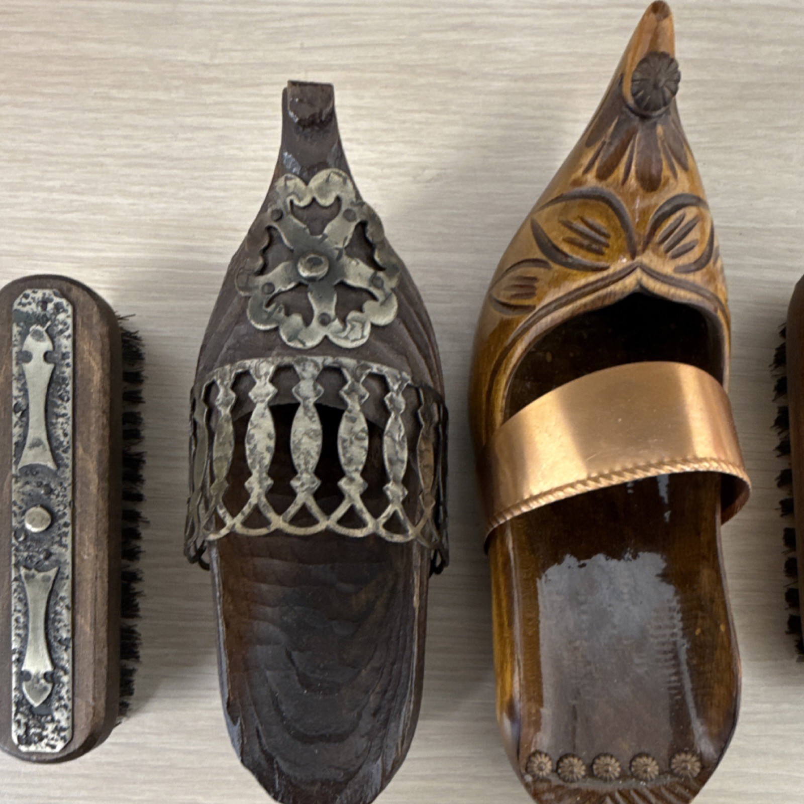как выглядит Bretagne Wooden Shoe Brushes Decorative Shoes Brown Bronze Wood Metal Set фото