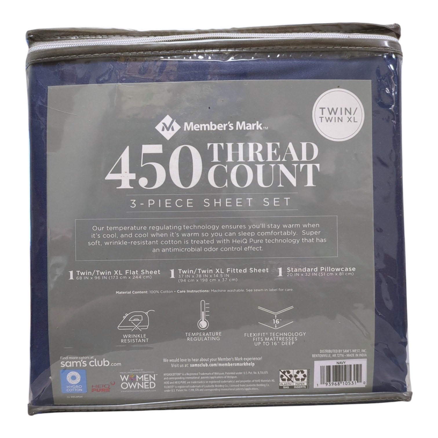 Member's Mark 450 Thread Count Solid 3 Piece Sheet Set, Twin/Twin XL Navy