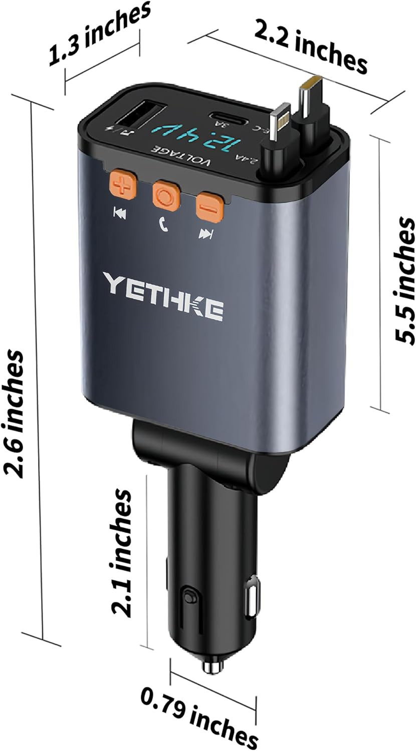 Bluetooth Car Adapter with Retractable Charger, FM Transmitter Bluetooth 5.4 for