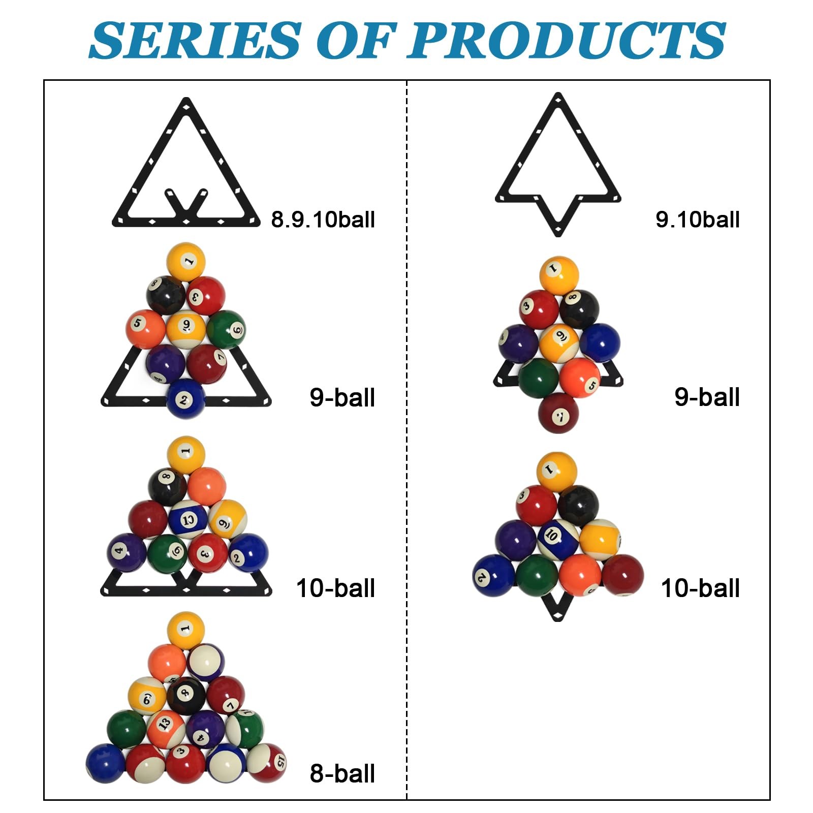 Included Components: 6 Pack Pool Ball Racks , 3 Pieces For Each Kind,