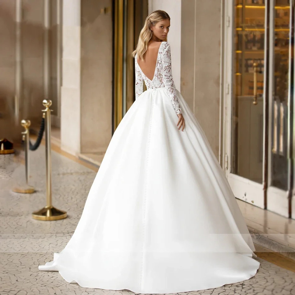 Elegant Satin A-Line Wedding Dresses V-Neck Long Sleeves Appliques Bridal Gowns