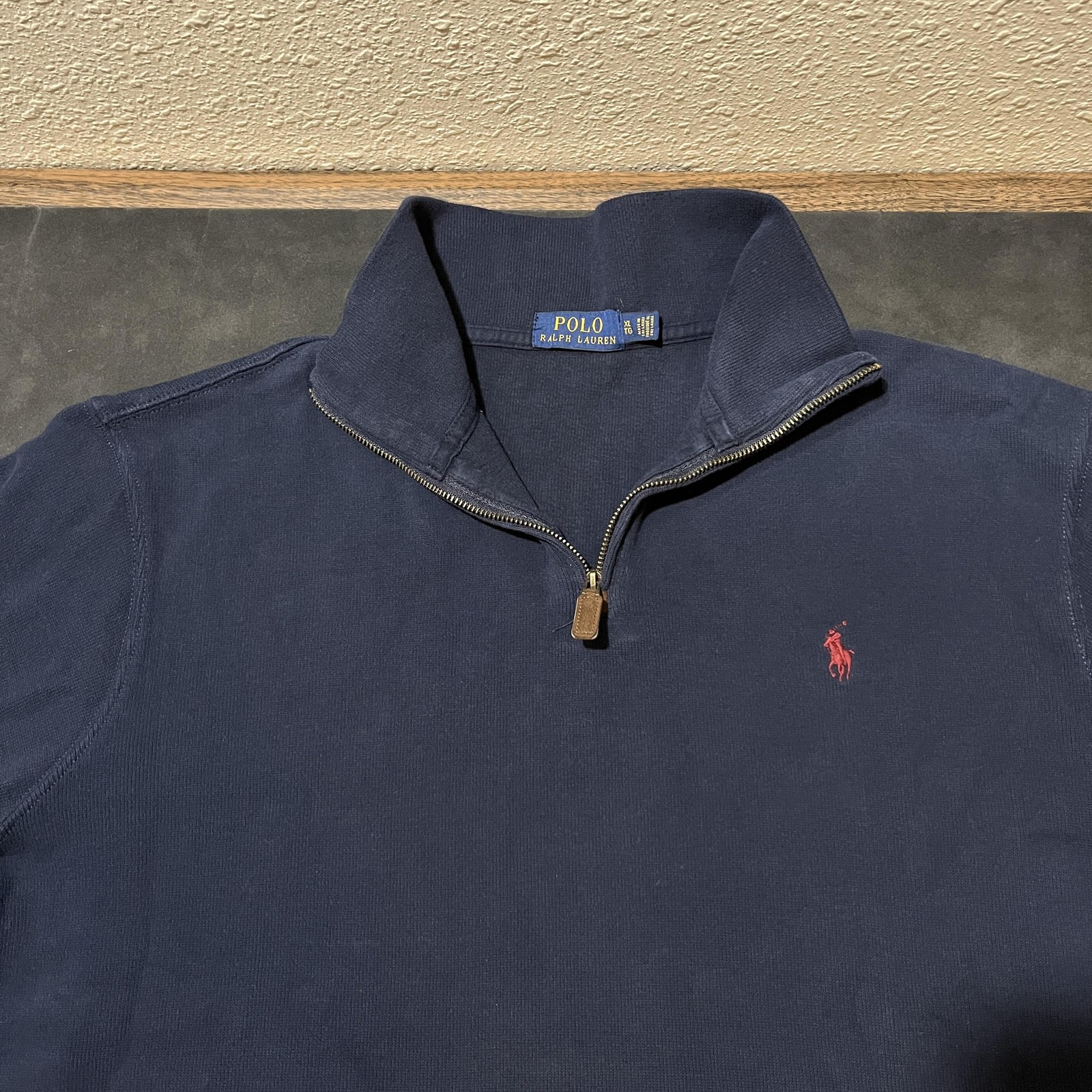 как выглядит Polo Ralph Lauren Pullover Mens XL Navy Blue Quarter Zip Sweater Red Pony Logo фото
