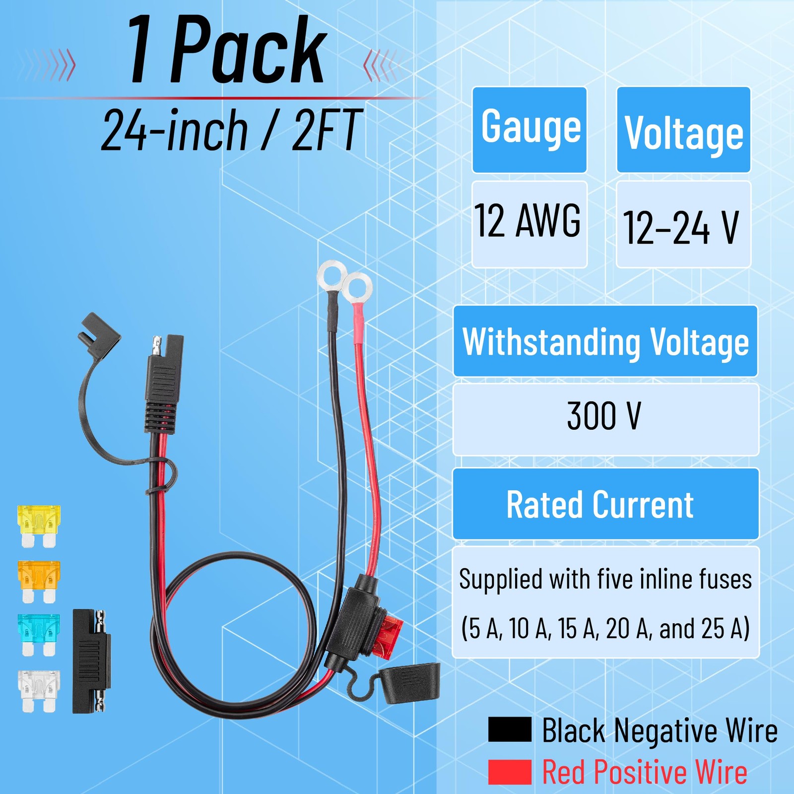 SAE Battery Connector, 2 FT, 12 AWG, SAE to O-Ring Harness with 5A-25A Fuses