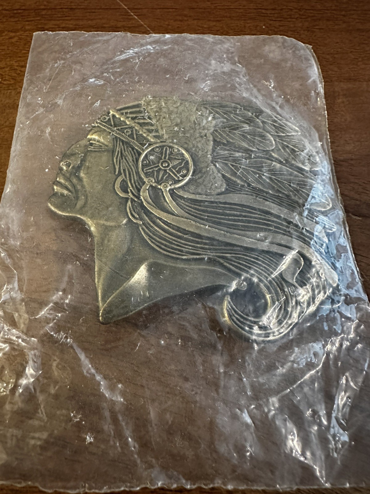 Vintage Brass Native American Indian Head Chief Belt Buckle NIP