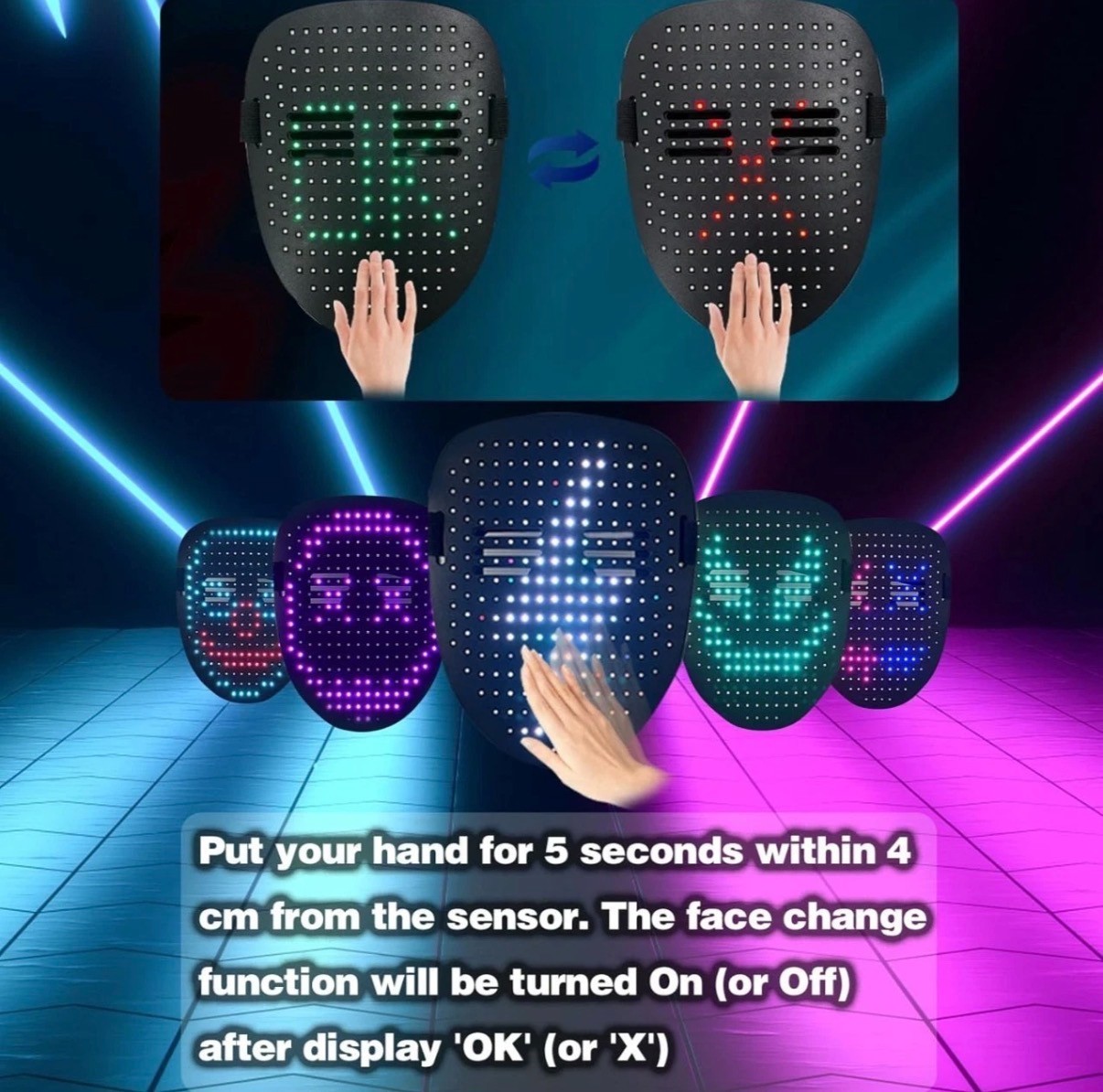 LED Light Up Mask Gesture Sensing RGB Face Mask 50 Patterns Cosplay Party