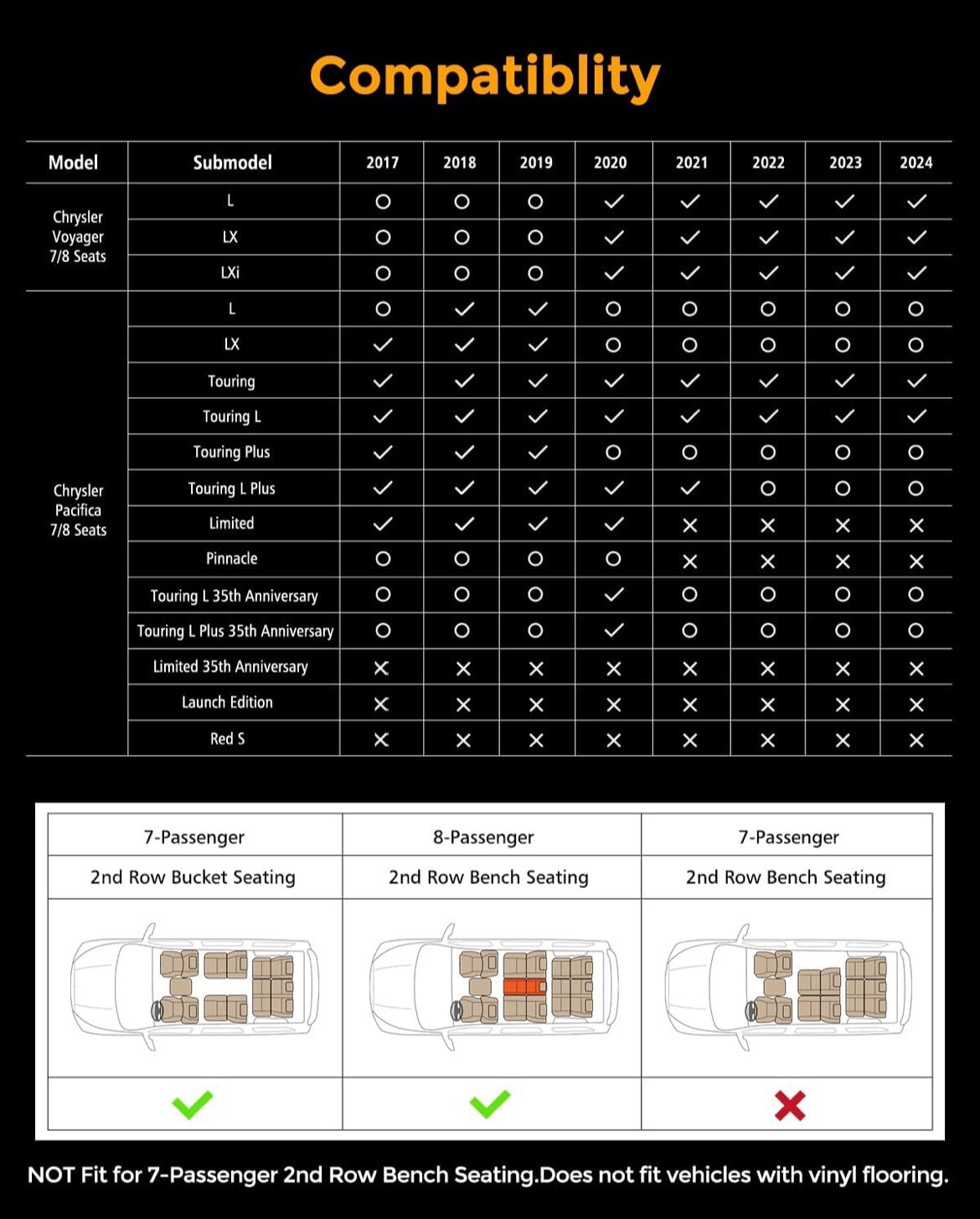 • for Chrysler Pacifica 2017-2024 2025 7/8 Passenger No Hybrid Floor Mats Cargo