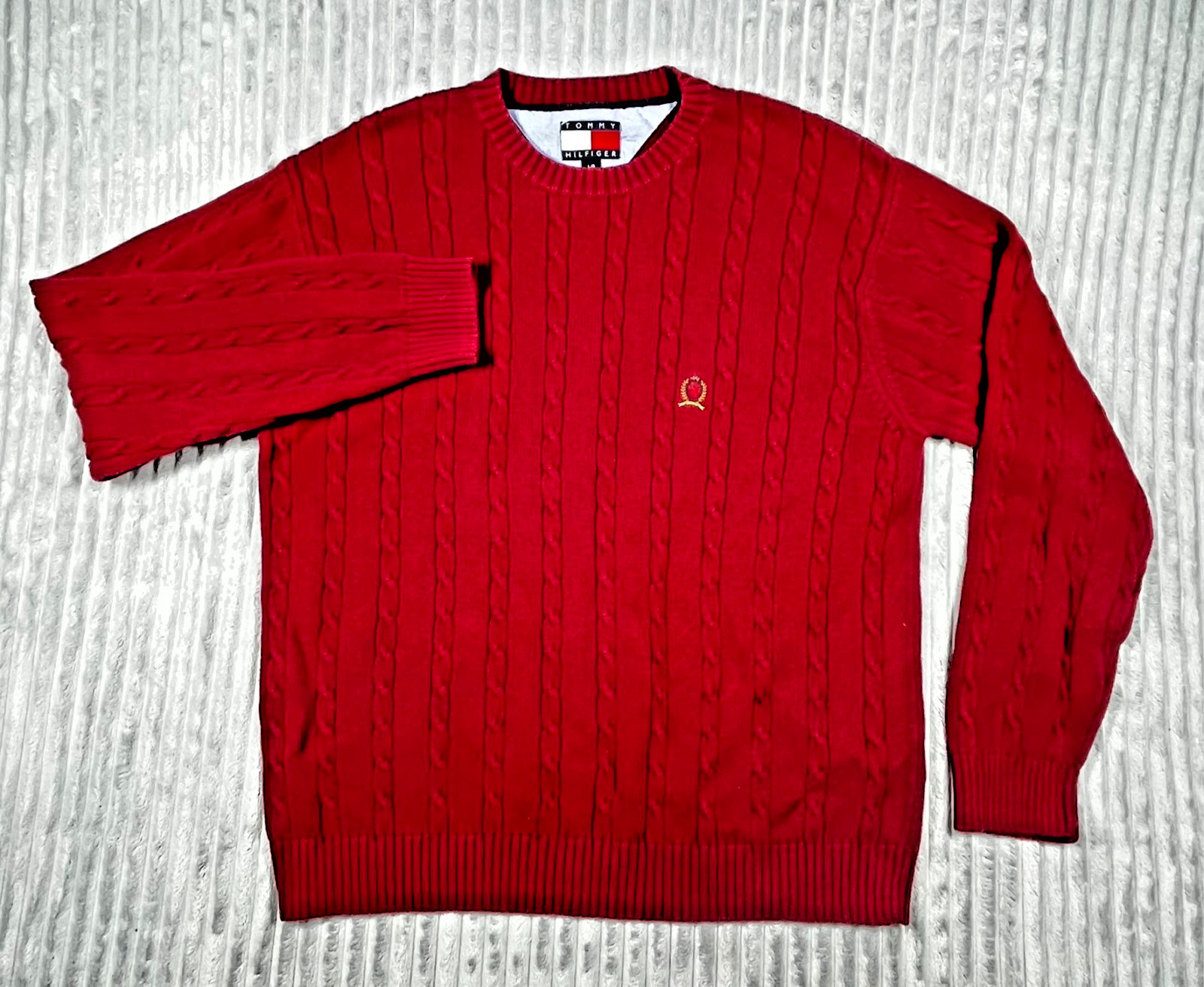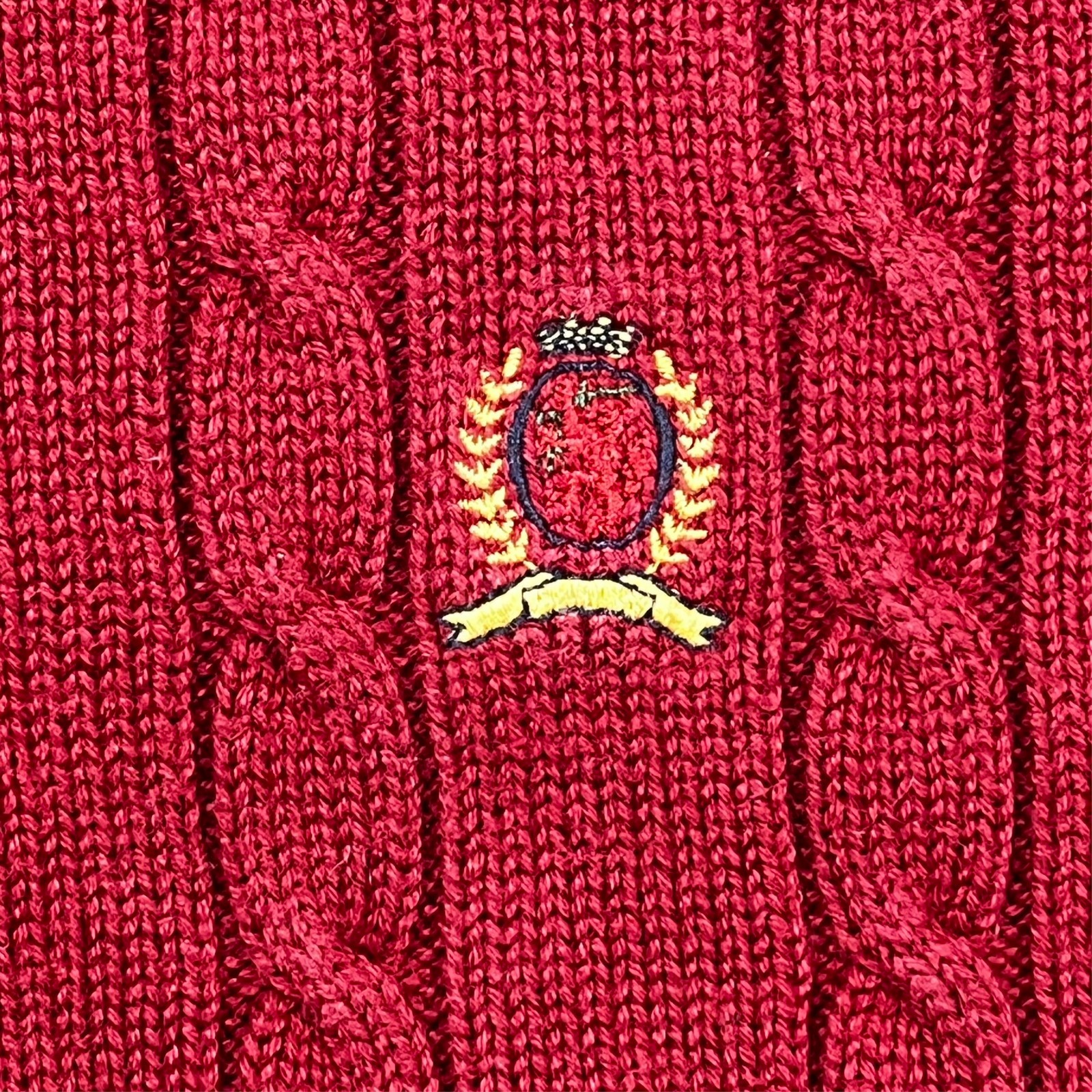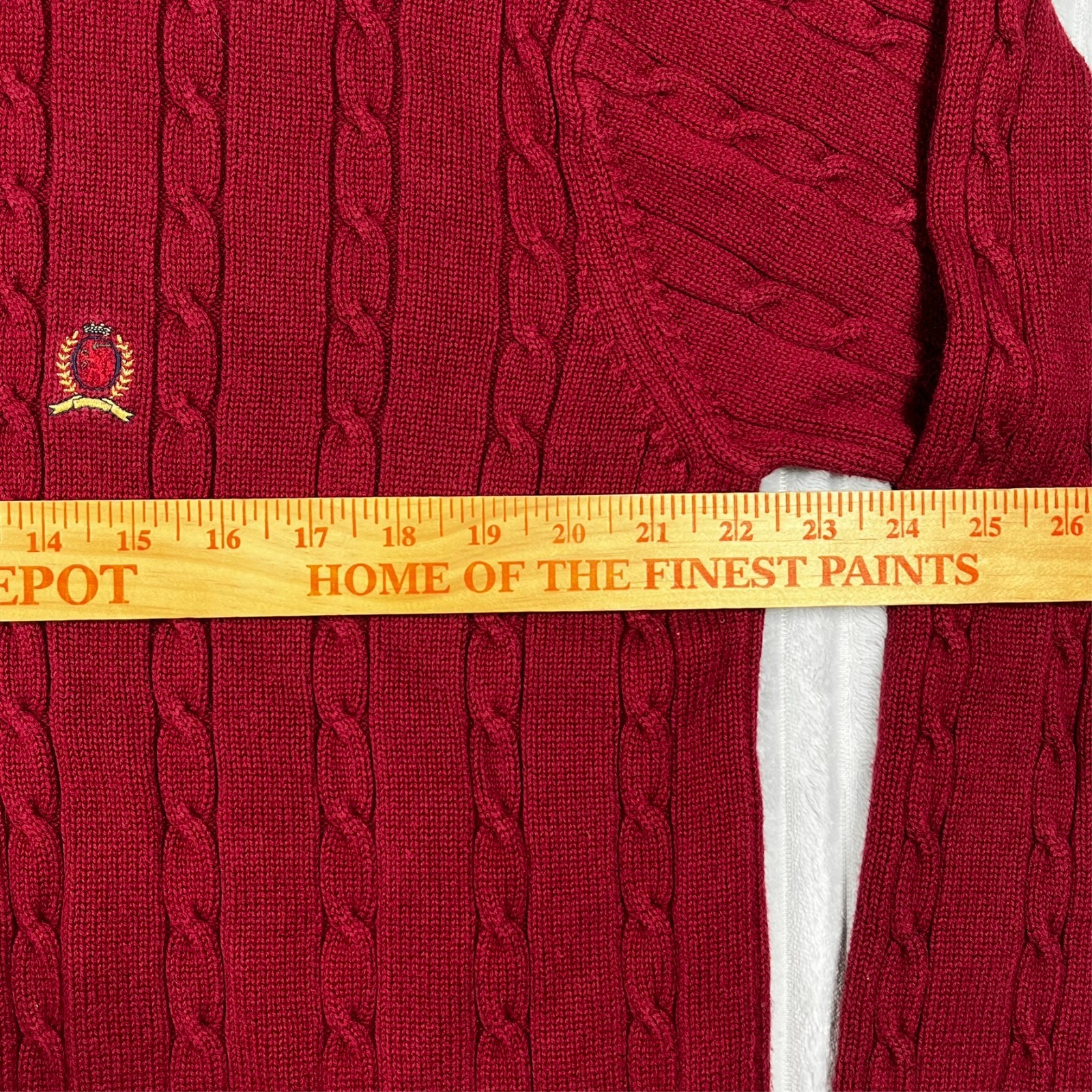 Tommy Hilfiger Cable Knit Sweater Men's L Burgundy Crest Logo Preppy Y2K Flaw