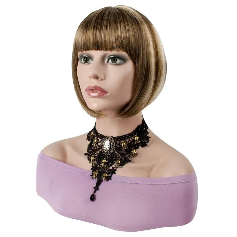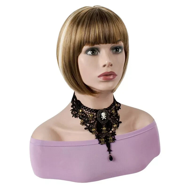 Women's Gold Blonde Mixed Brown Highlights Short Bob Straight Wig Synthetic Hair