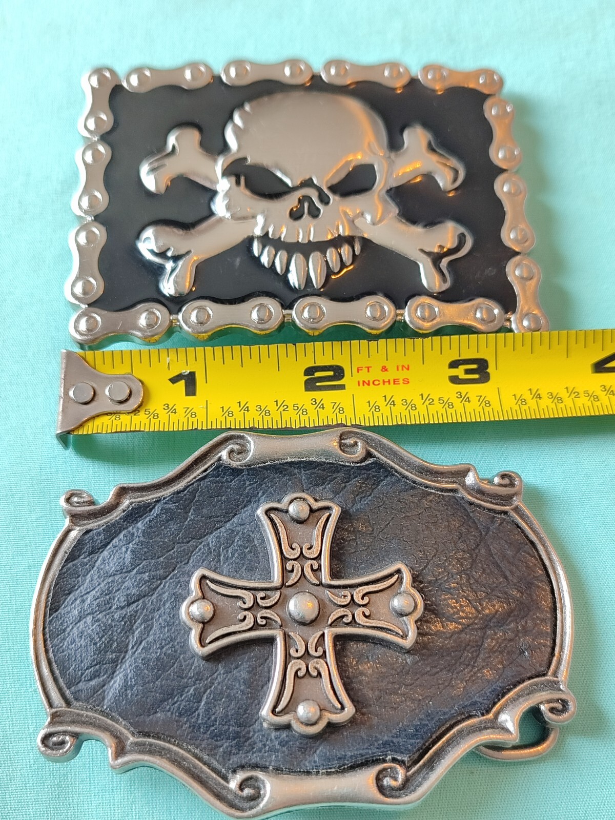 Silver Tone Black Enamel Leather Goth Gothic Belt Buckle Set Cross Skull