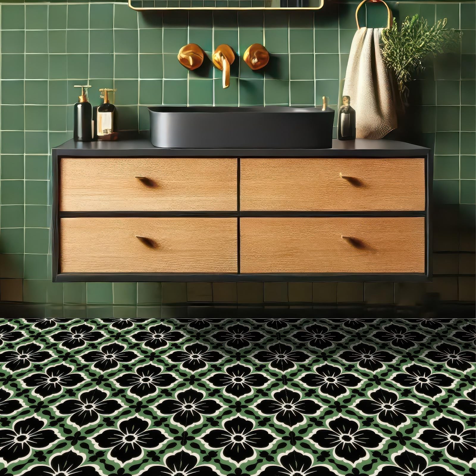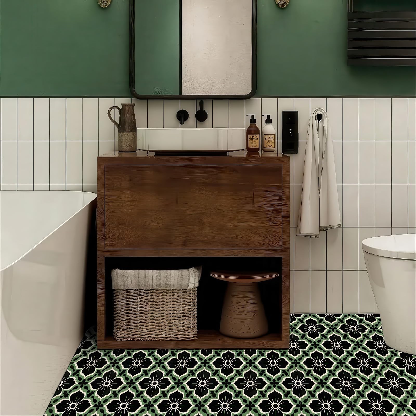 10PCS 12x12 Inch Green and Black Floral Tile Pattern Floor Tiles Peel and Sti...