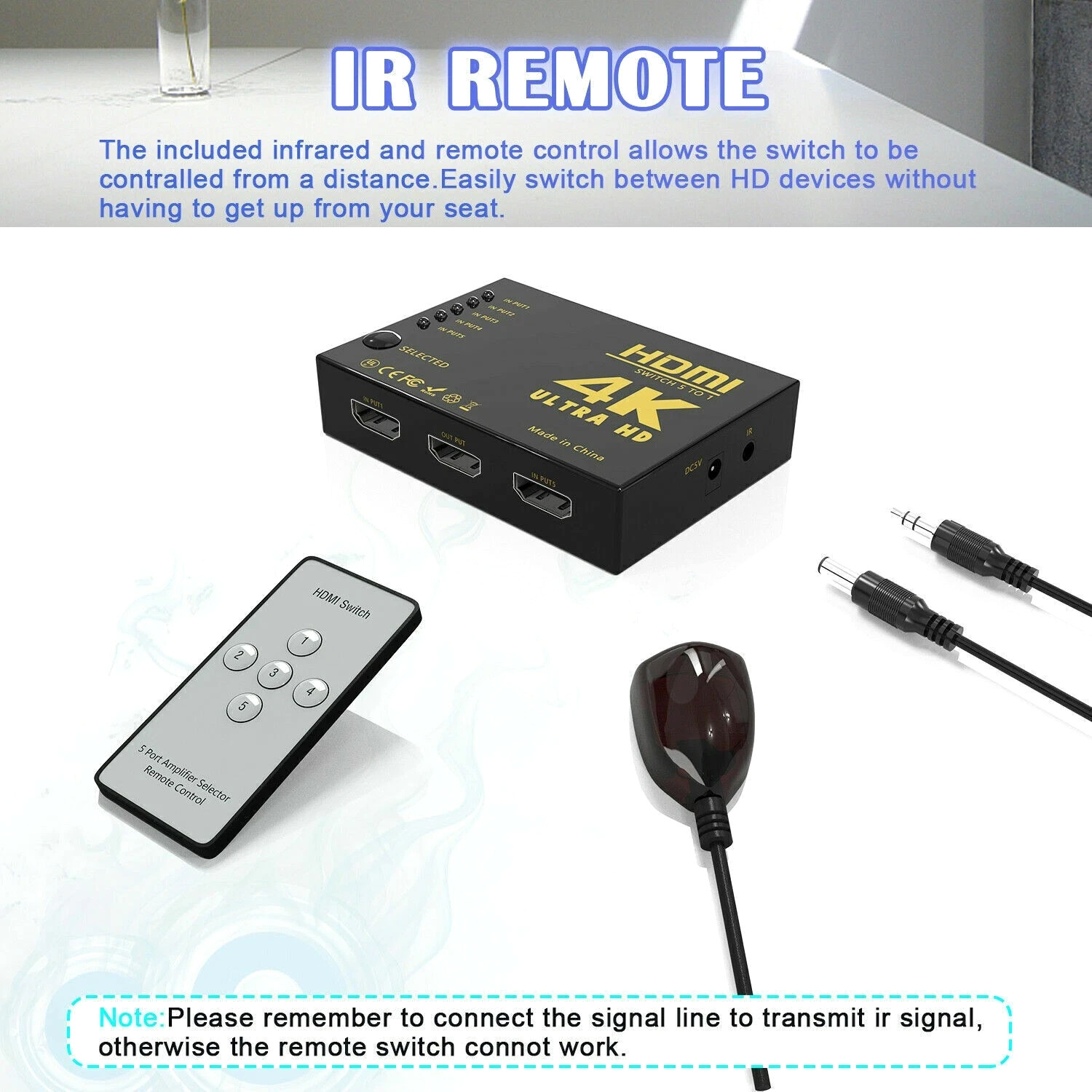 HDMI 2.0 Switch Type: 5 to 1 Switch with Infrared Remote Control