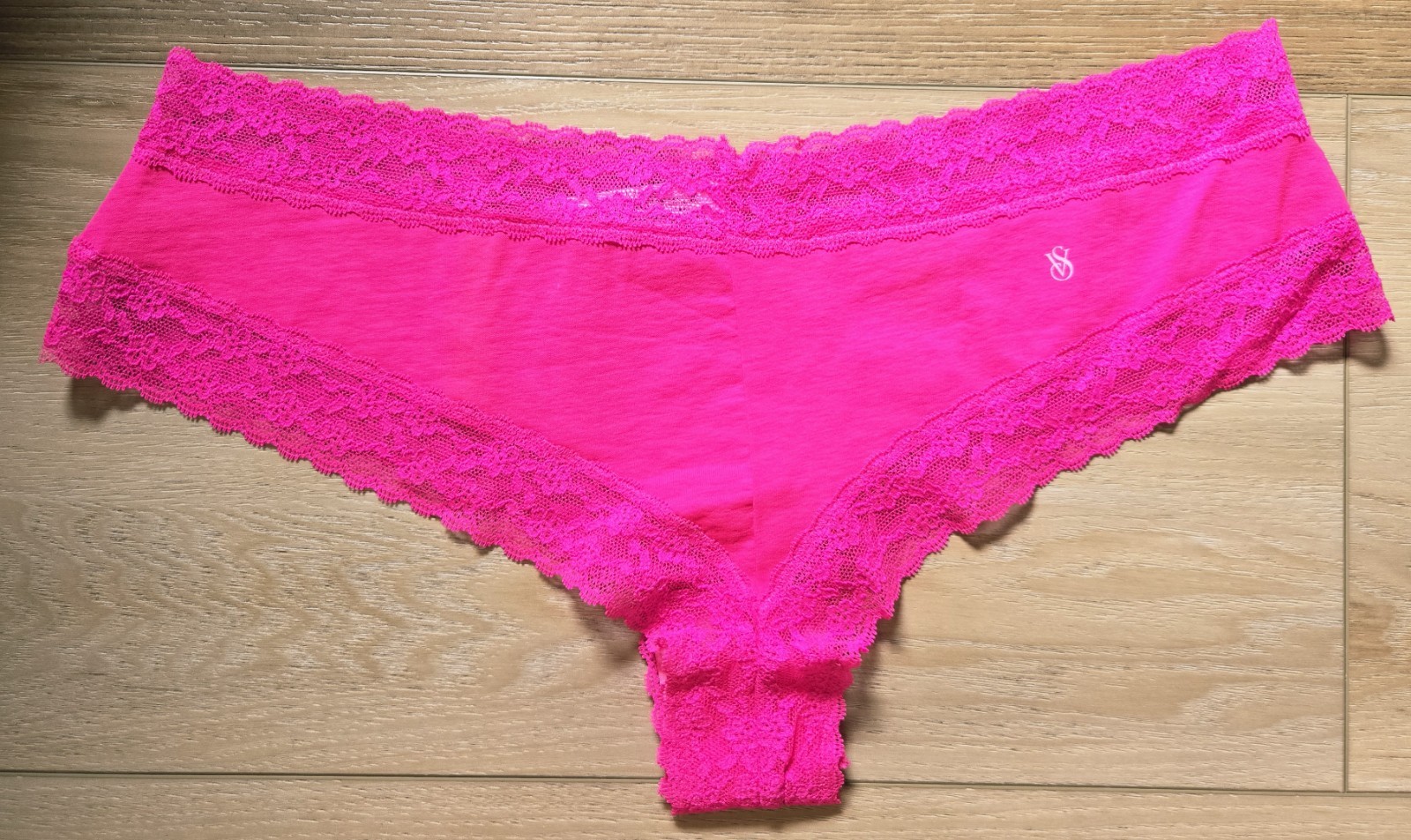 как выглядит NWT Vintage Victorias Secret Hot Pink Cotton Blend Lace Trim Cheeky Panties L фото