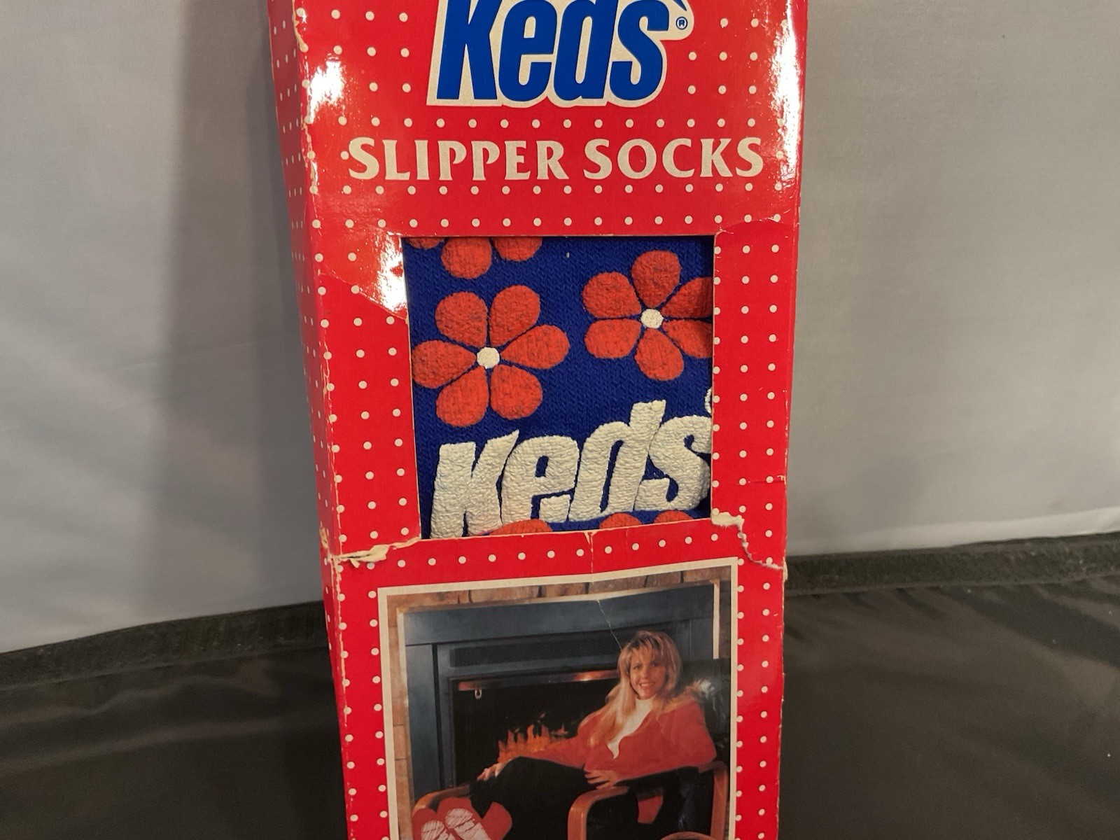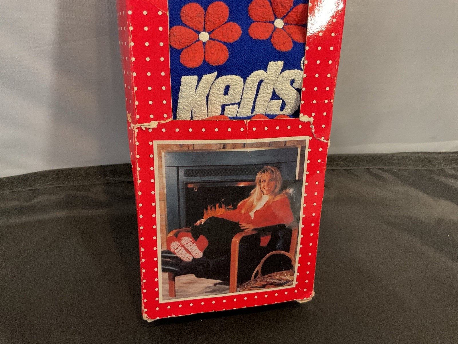как выглядит VINTAGE NEW 1981 LADIES KEDS TOASTIES THE SLIPPER SOCK USA Blue Flower One Size фото