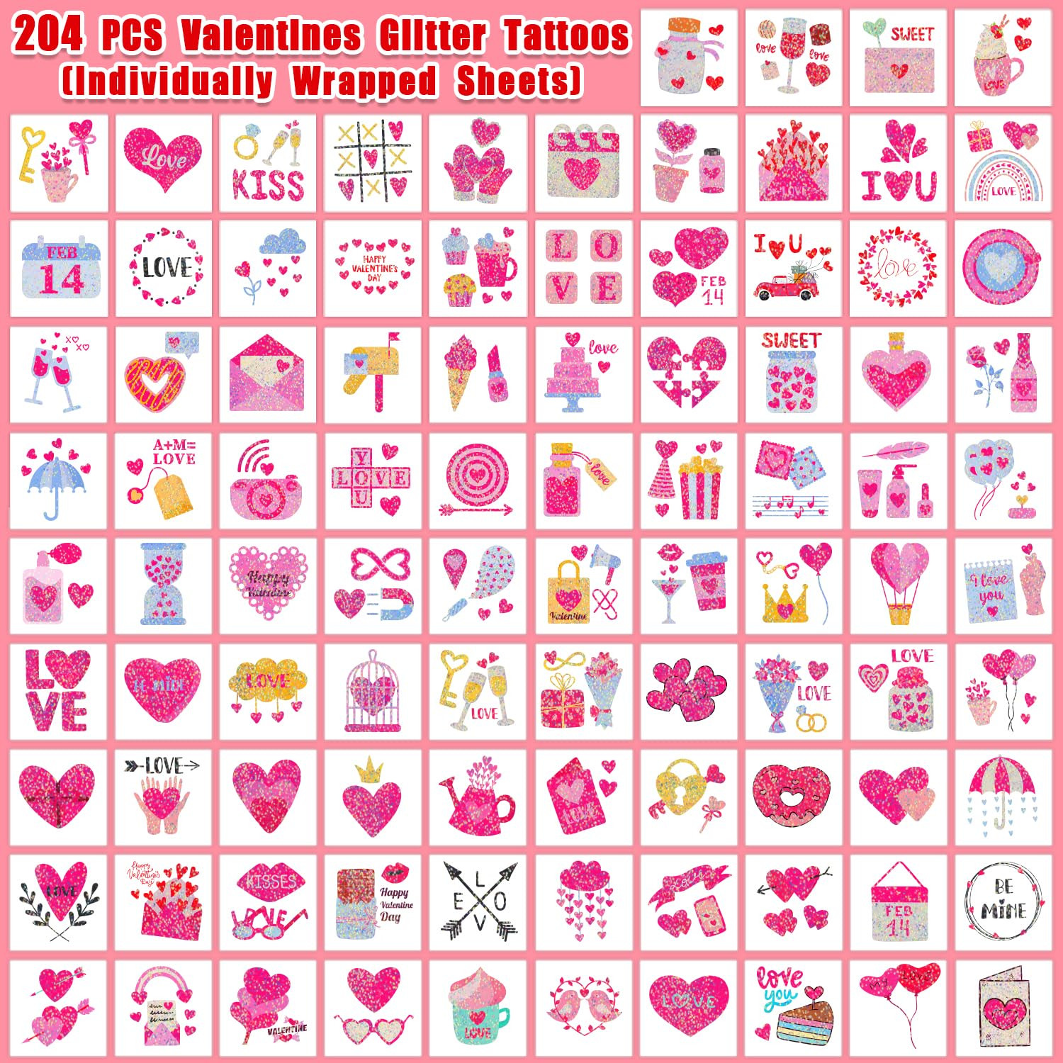 204 Glitter Styles Valentine'S Day Kids Temporary Tattoos, Valentines Party Supp
