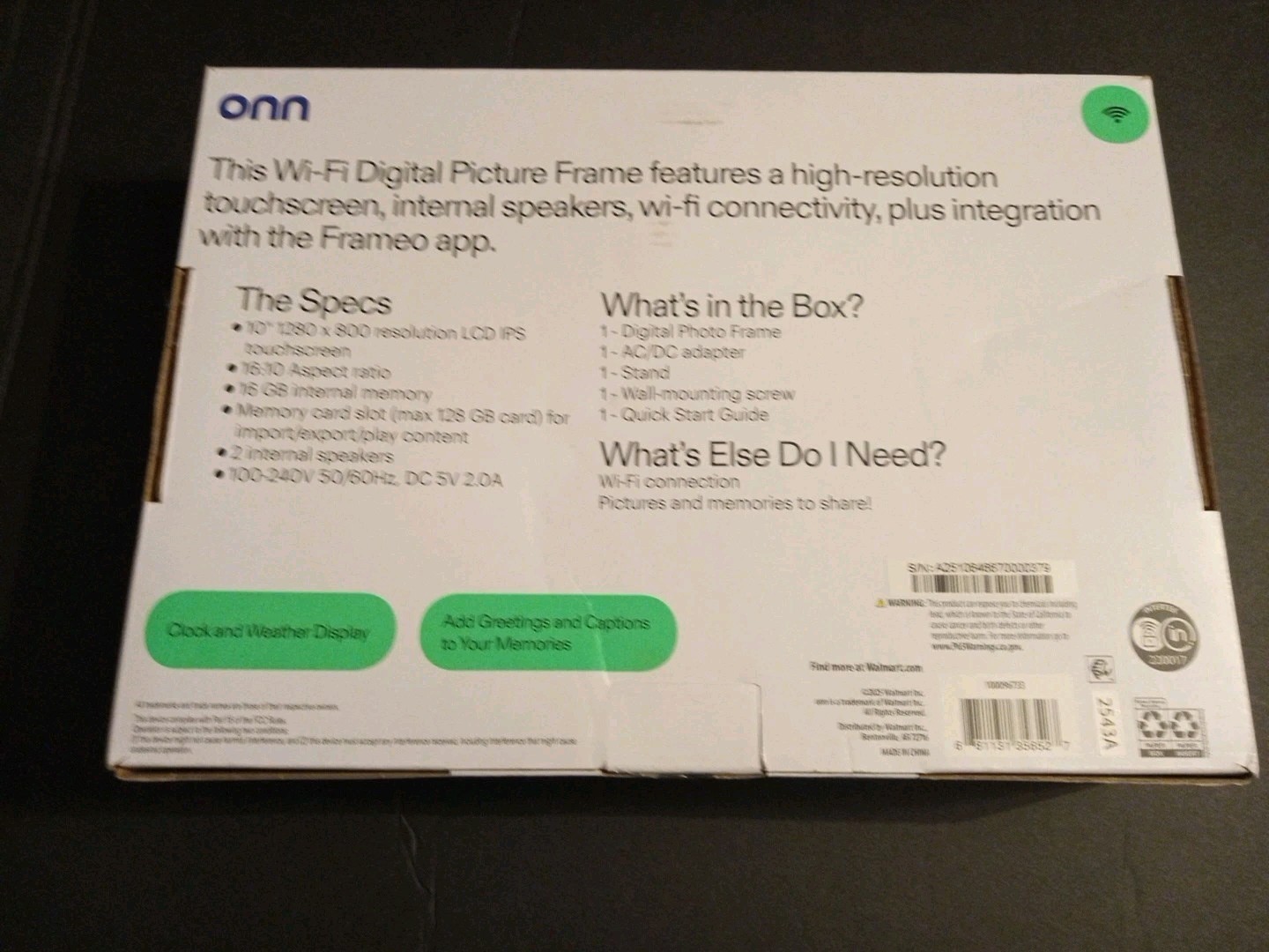 ONN 10 Wi-Fi Digital Picture Frame Free Frameo app iOS Android 16GB