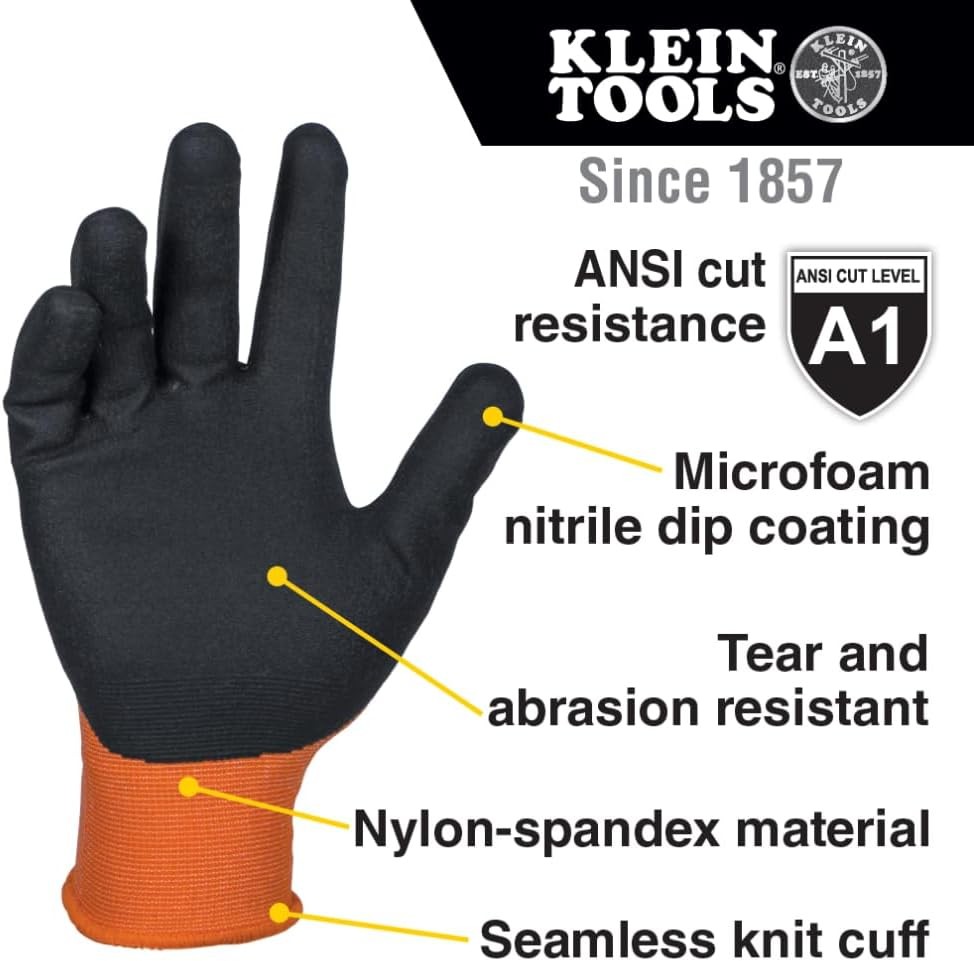 Klein Tools 60582 Work Gloves, Knit Dipped Cut Resistant ANSI A1 Nitrile Coated