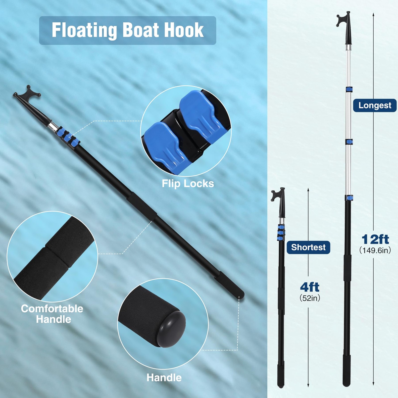 Boat Hooks for Docking,4-12ft Telescoping Pole with Hook,Sturdy and Lightweig...