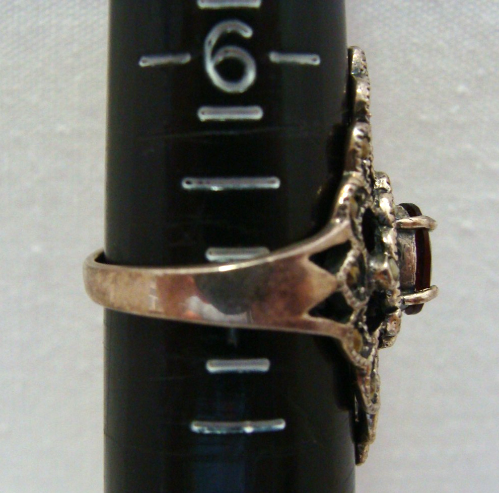 как выглядит Sterling Silver Ring With Red Garnet Center Stone Marcasite Accents Size 6.75 фото