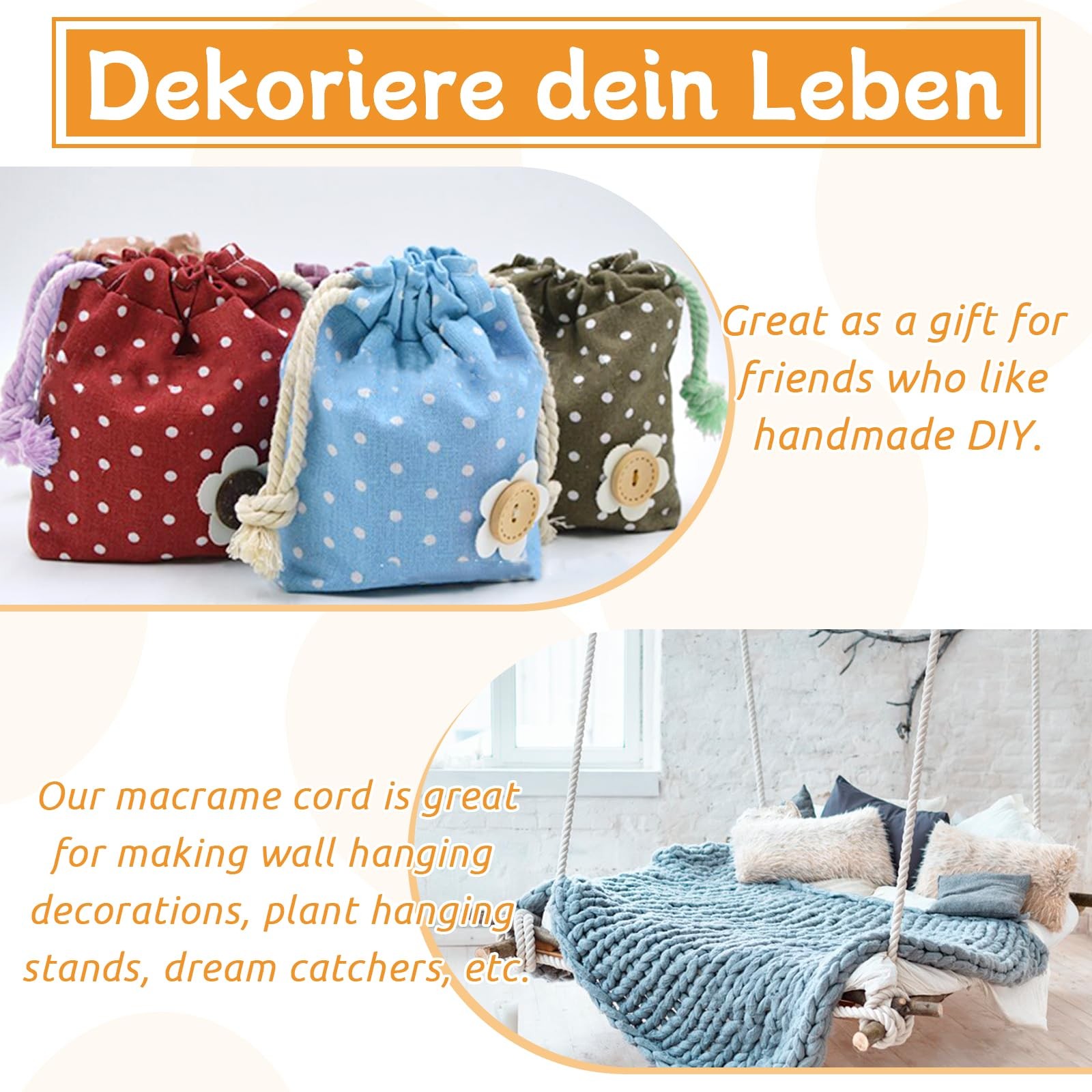 Cotton Macrame Cord 8mm x 131ft Thick Rope Yarn 3 Strand Twisted Black Craft