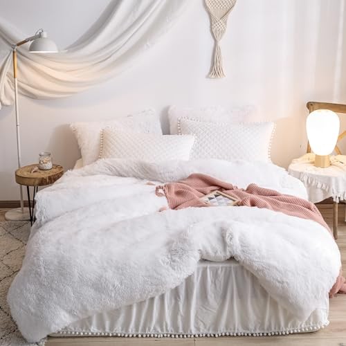 Faux Fur Comforter Cover Set, Fuzzy Bedding Set 2 Pieces 1 Fluffy Twin White