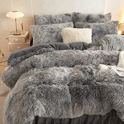 Shaggy Comforter Cover Set, Faux Fur Dark Gray twin Twin Tie Dye Dark Gray