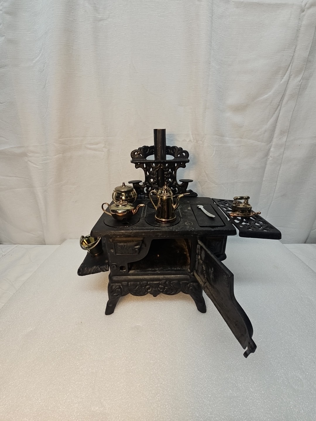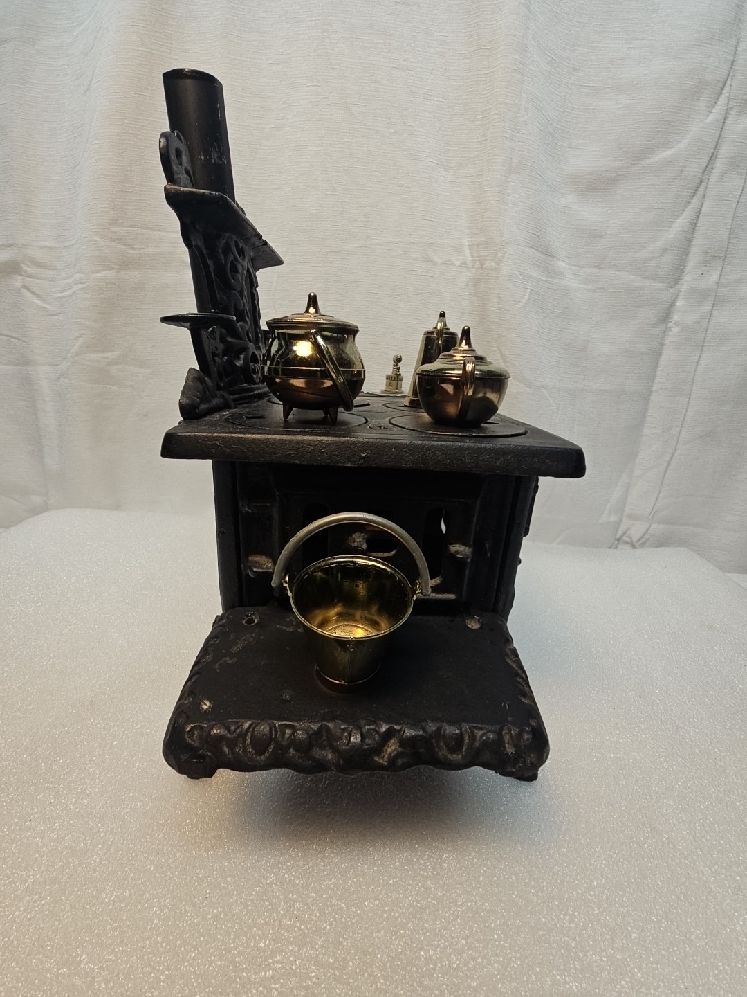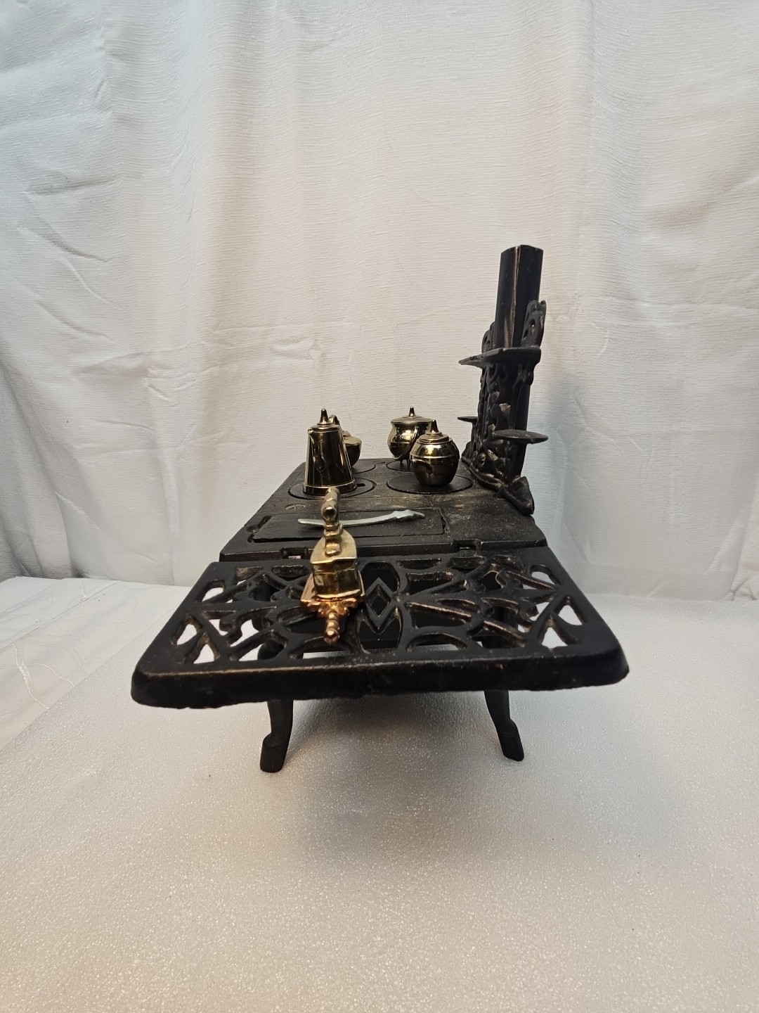 VTG Crescent Mini Cast Iron Black Toy Stove W/Accessories Gold 8.5X6.5X11.5X13