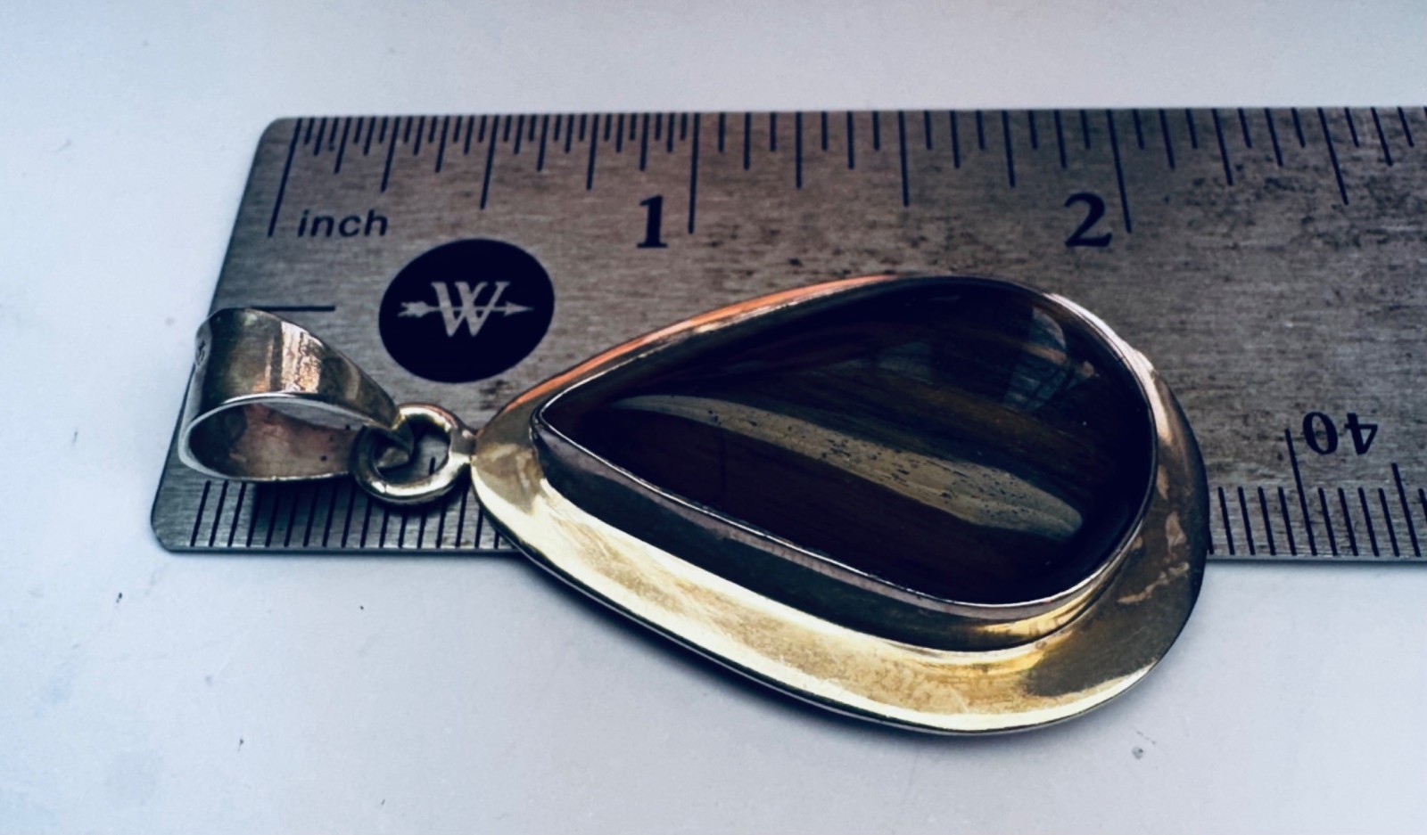 Estate Teardrop Tiger Eye Pendant 925 Sterling Silver Large Statement No Chain