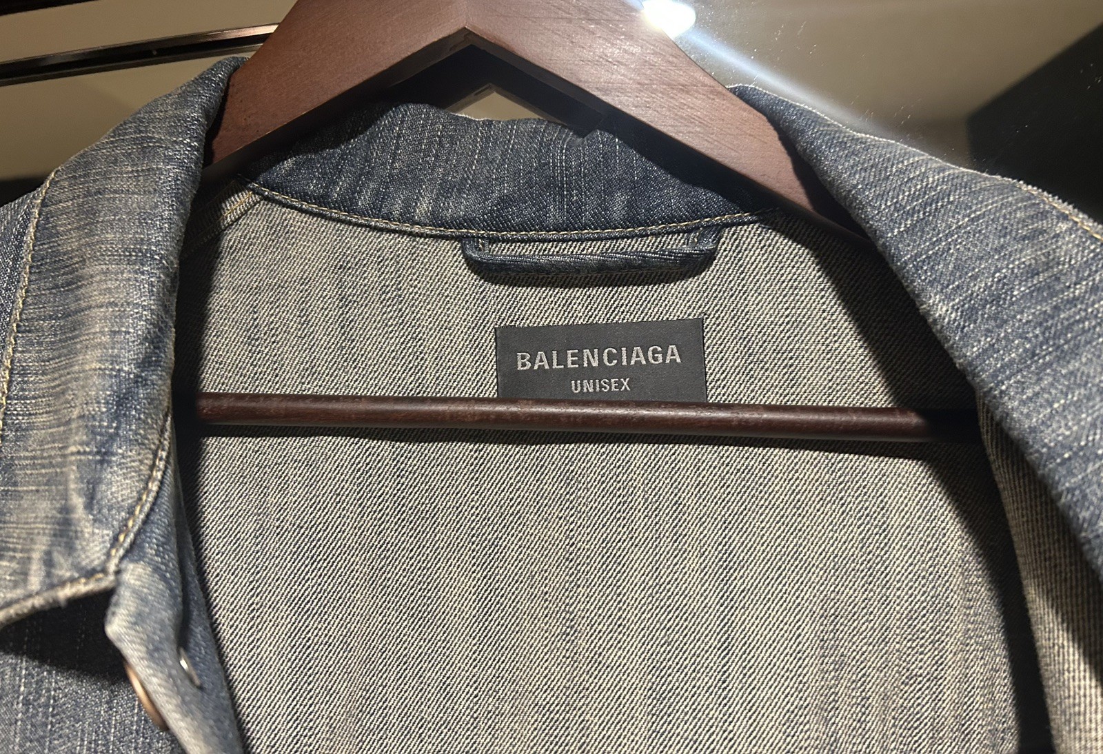 как выглядит Balenciaga Distressed Scribble Rhinestone Denim Jacket фото