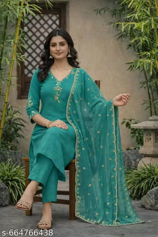 как выглядит Women Embroidered Silk Blend Calf Length Straight Kurta Trouser with Dupatta Set фото