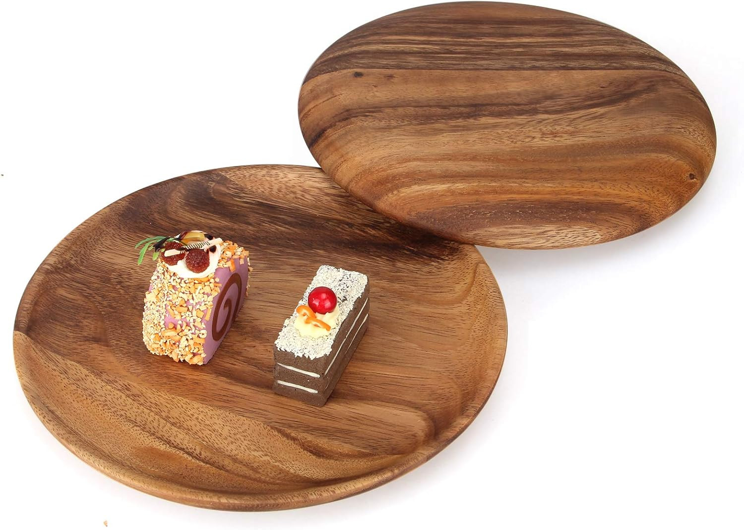 2 Pcs 10 Inch Acacia Wood Dinner Plates Set for Eating Wooden round Charcuterie