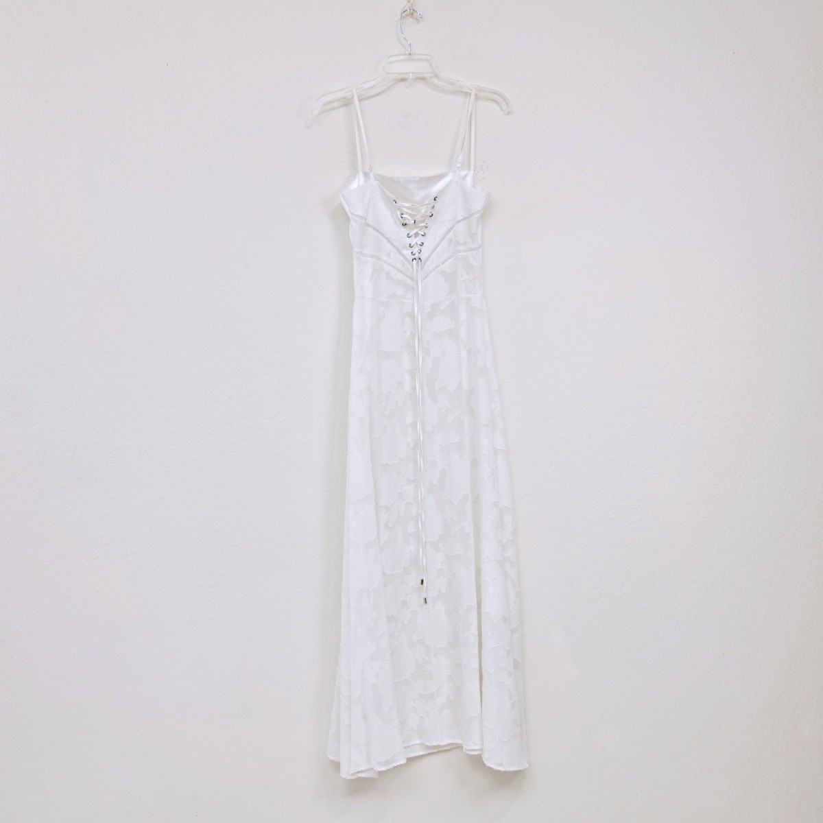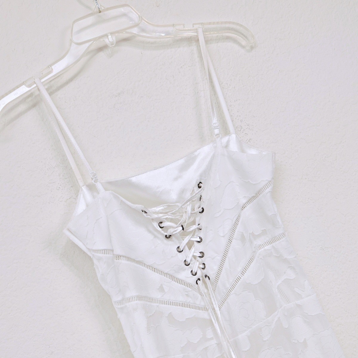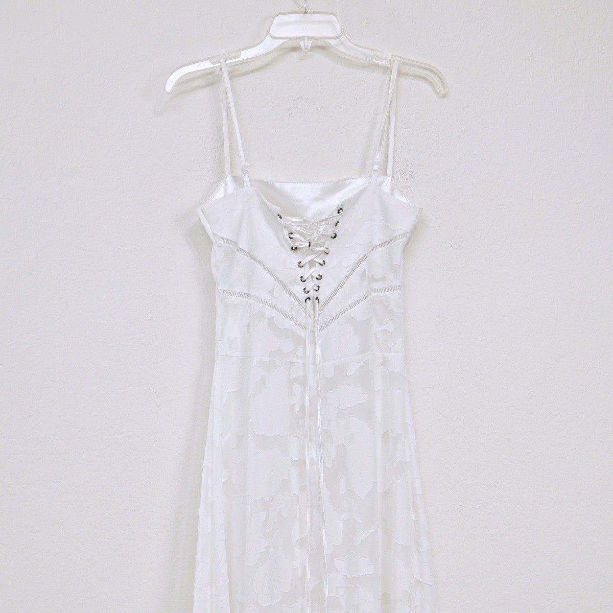 White Floral Burnout Satin Lace Up Back Slip Dress Coquette Midi Event Bridal S