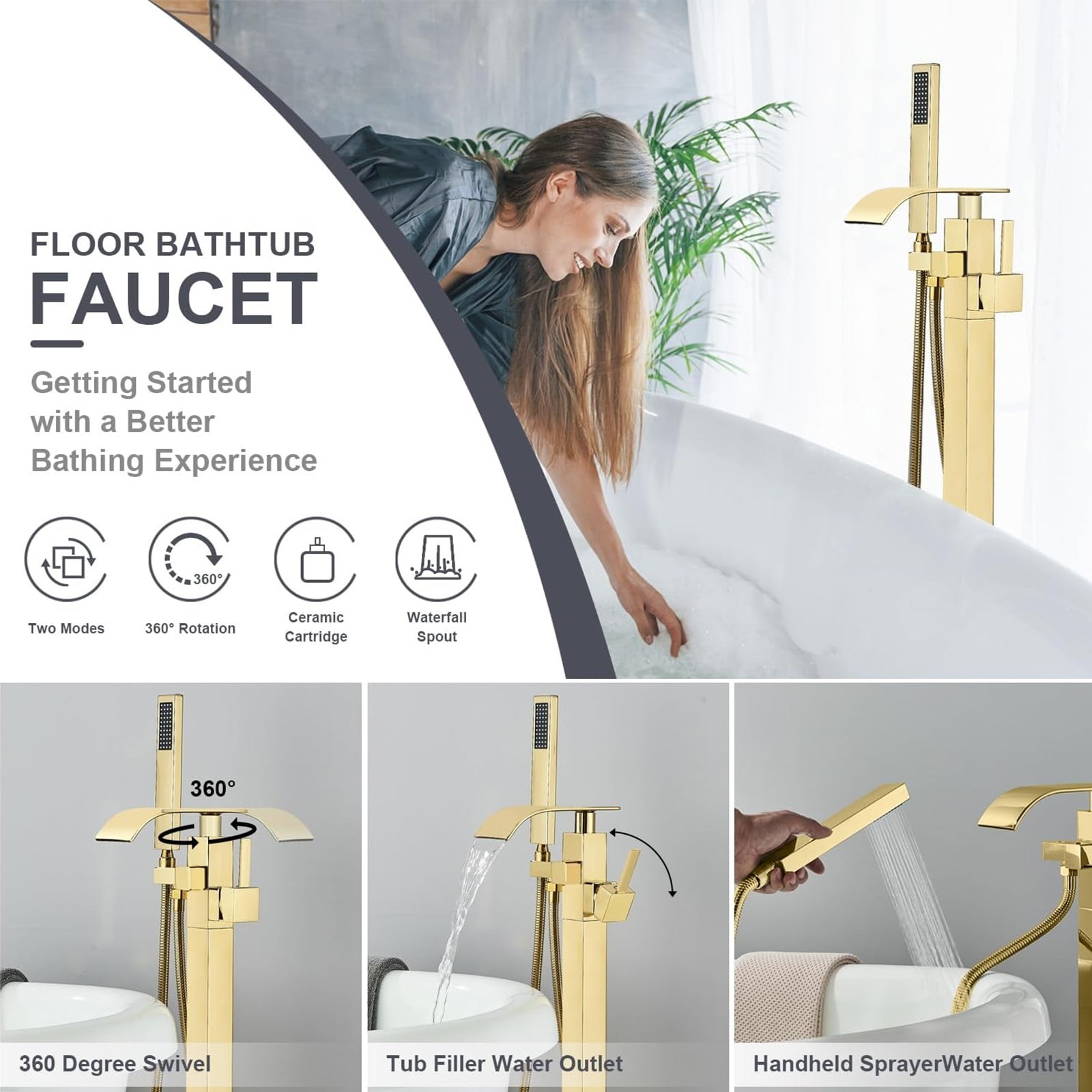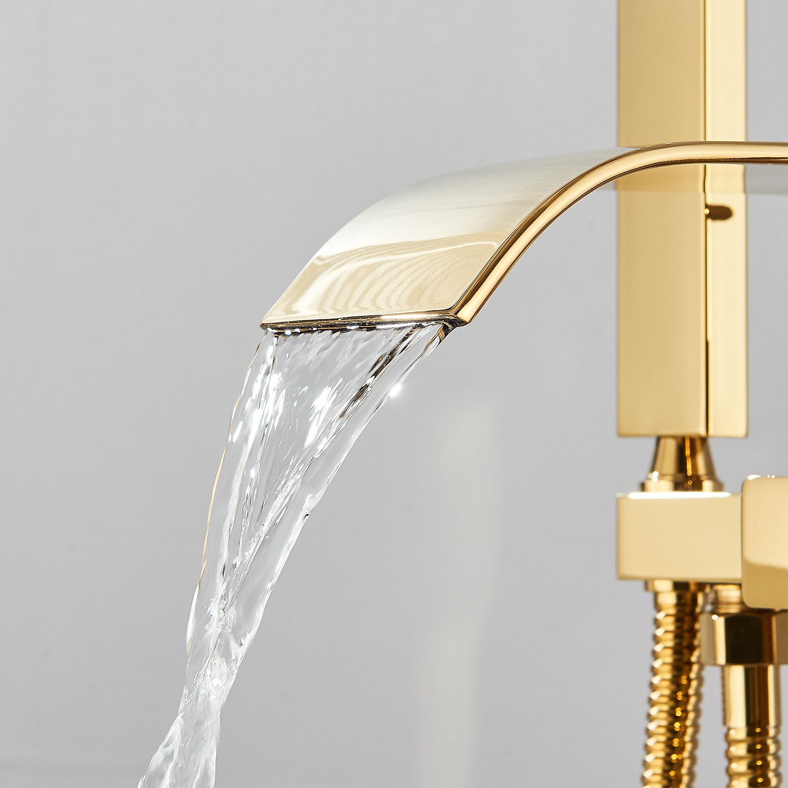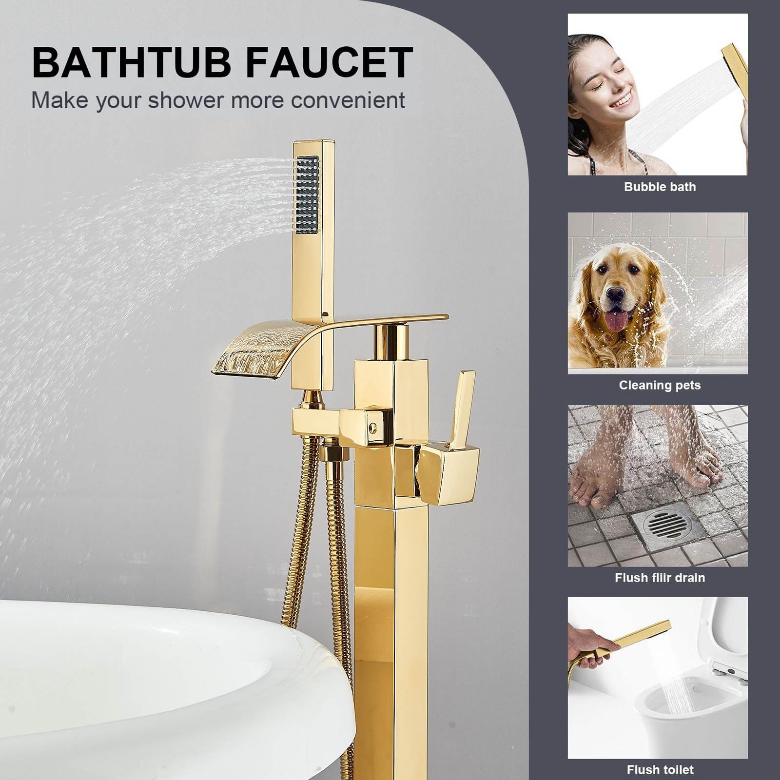 Freestanding Bathtub Faucet Gold Tub Filler Floor Mount Spout With Hand Shower