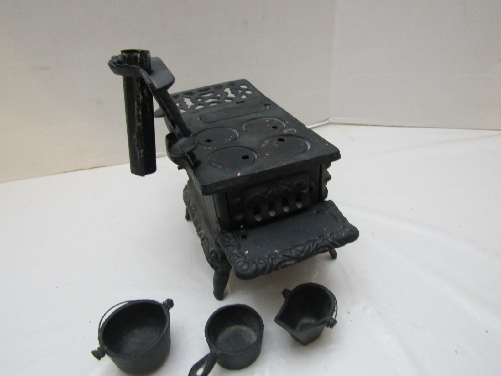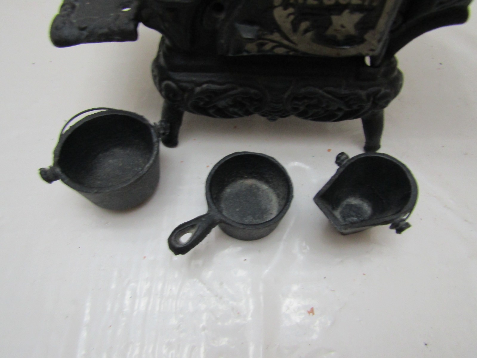 VINTAGE ANTIQUE CRESCENT CAST IRON STOVE MINIATURE SALESMAN SAMPLE POTS PAN
