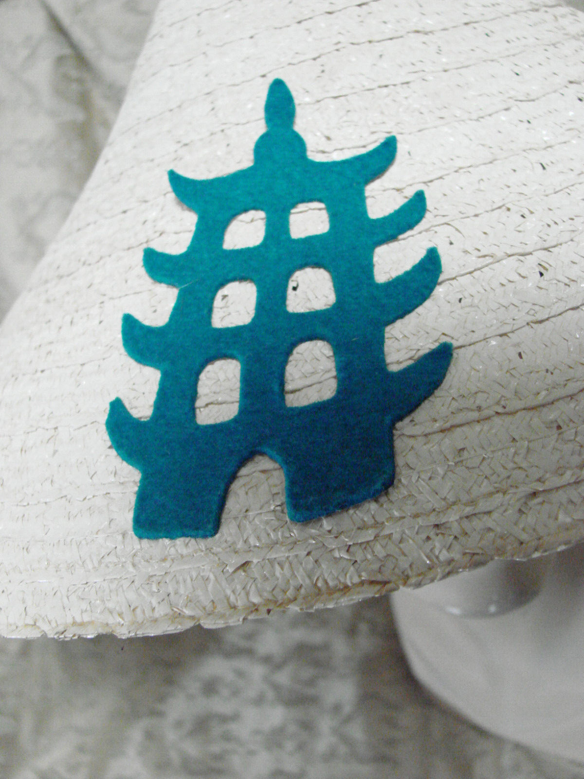 VTG 50s Straw Hat PAGODA APPLIQUE Lampshade Unique VGC Beach Sun Grommets