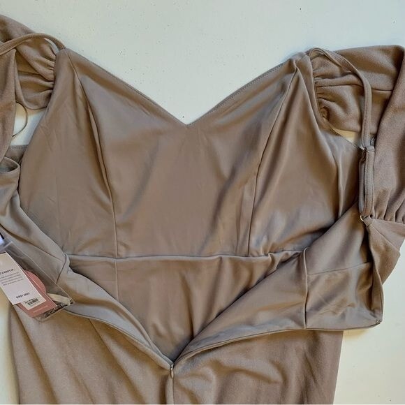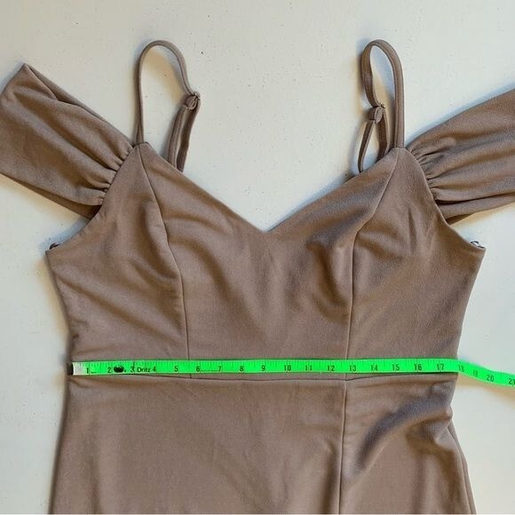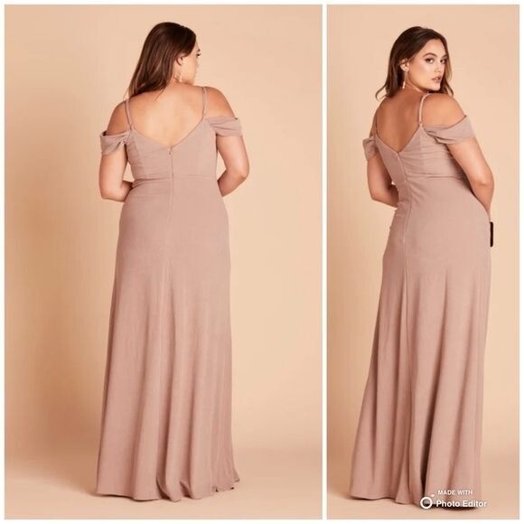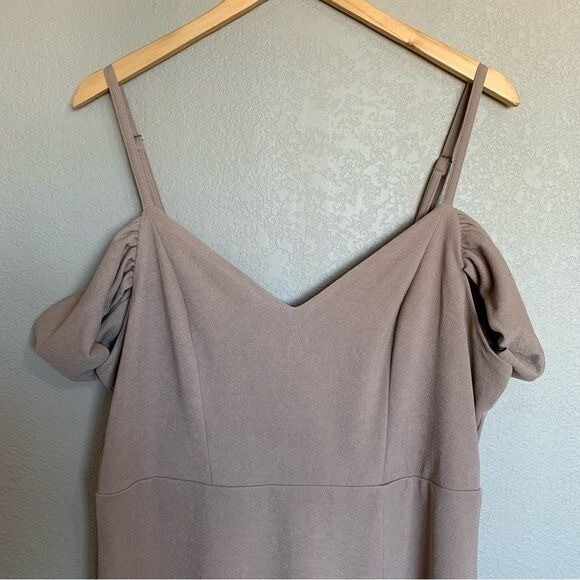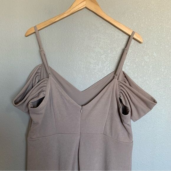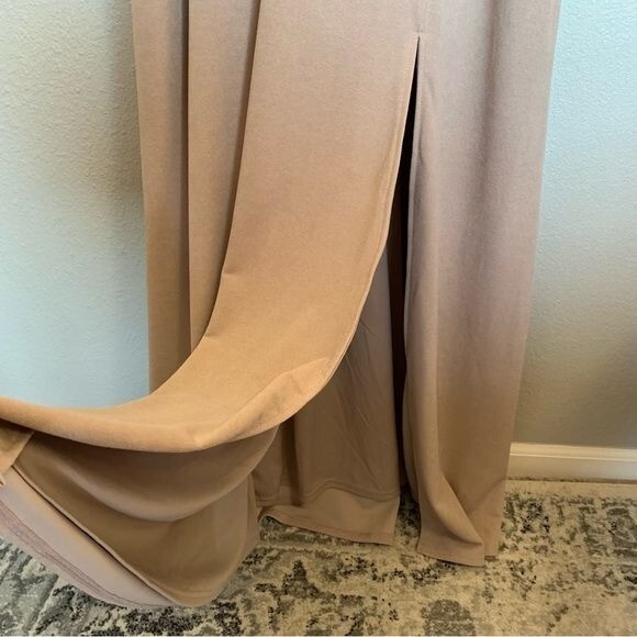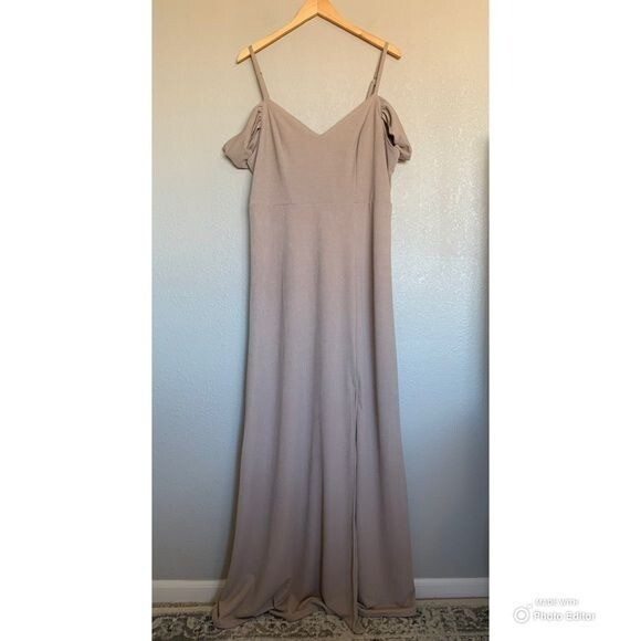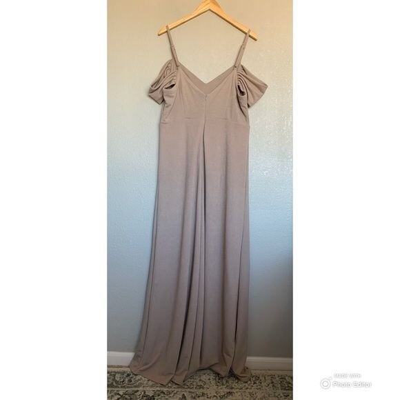 как выглядит Birdy Grey Taupe Crepe Dev Slit Maxi Dress Size XXL Formal Bridesmaid Dress NWT фото