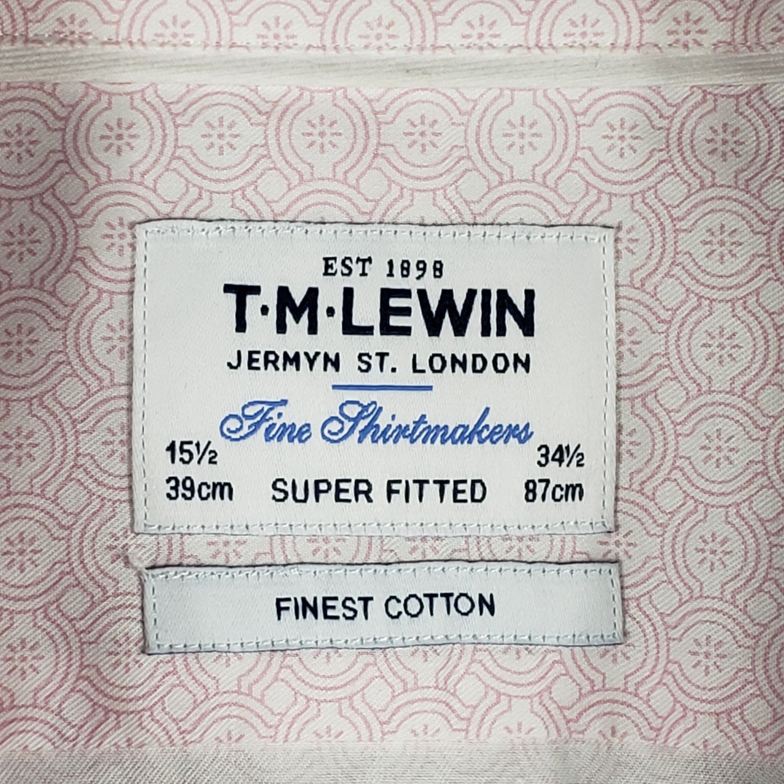 T.M. Lewin Men 15.5 34.5 Super Fitted Pink White Geometric Cotton Dress Shirt