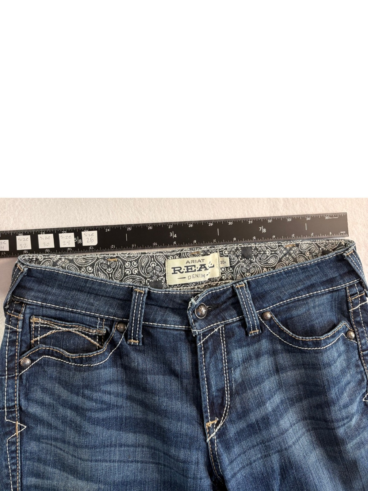 как выглядит Ariat R.E.A.L. Bootcut Jeans Womens 30R 32x31 Blue Whiskering Denim Cotton фото