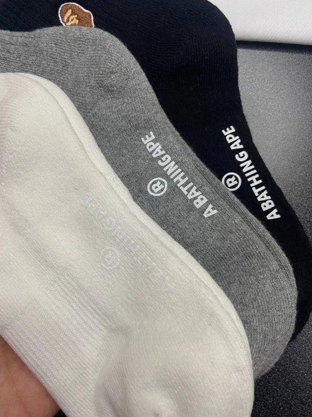 как выглядит A Bathing Ape BAPE Head Logo Crew Socks 3-Pack Black Gray White Embroidered NWT фото