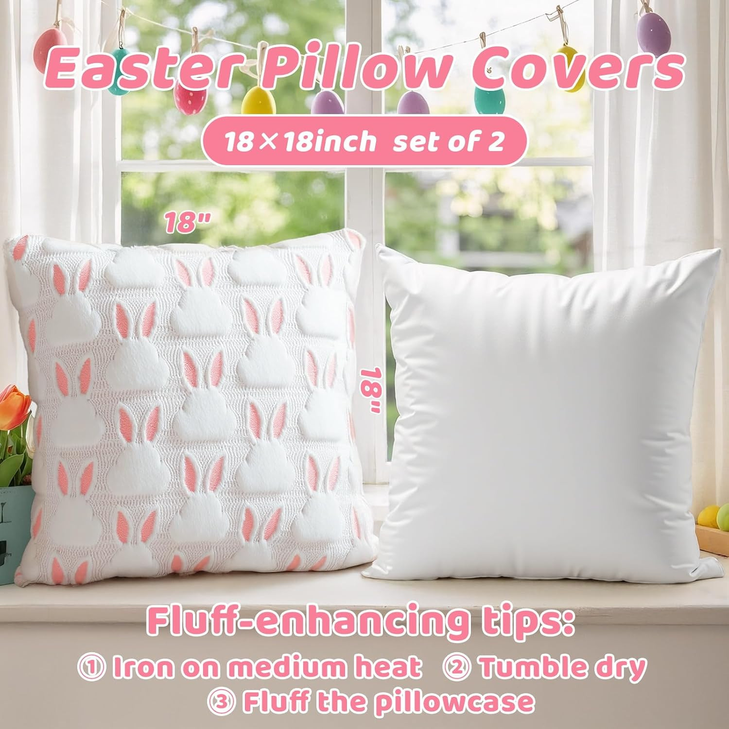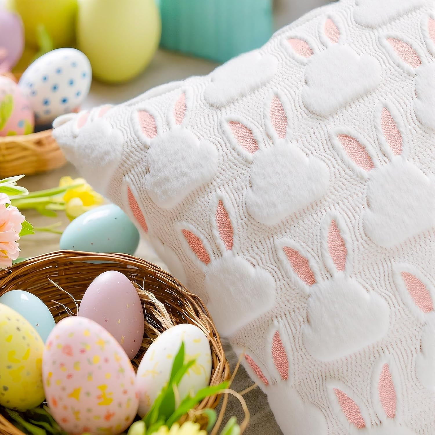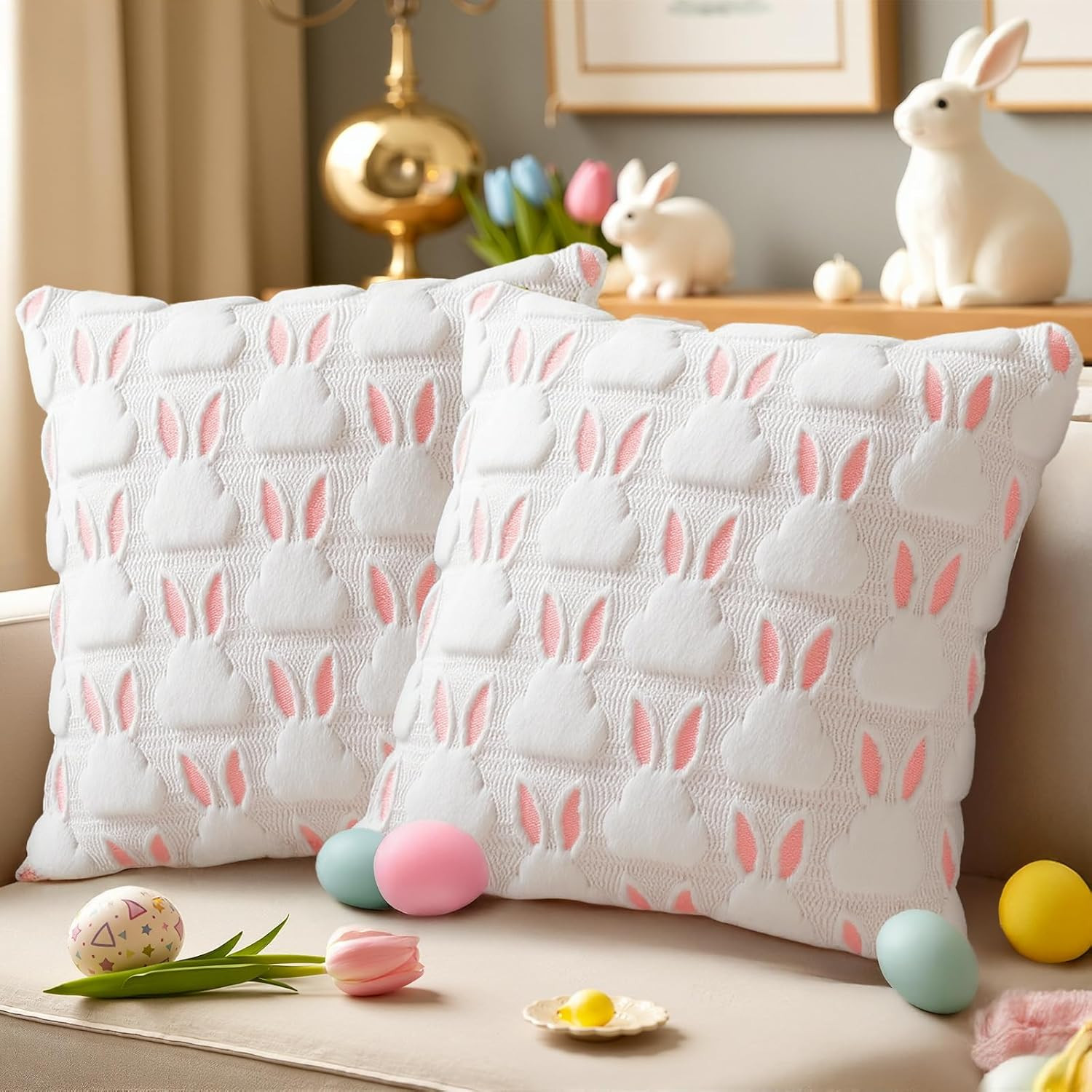 Easter Pillow Covers 18X18 Set of 2, Soft Plush Faux Fur with 3D Bunny Design, E