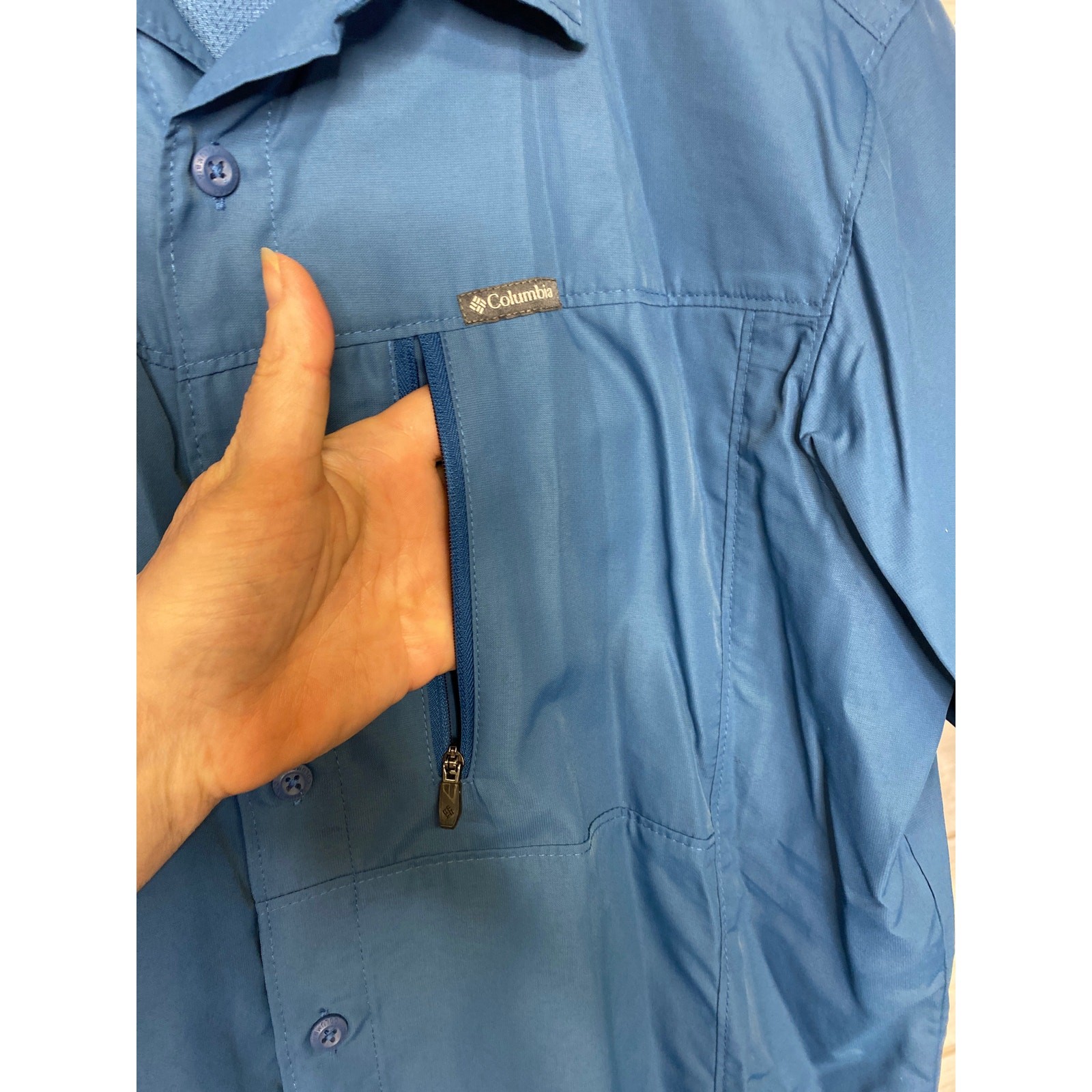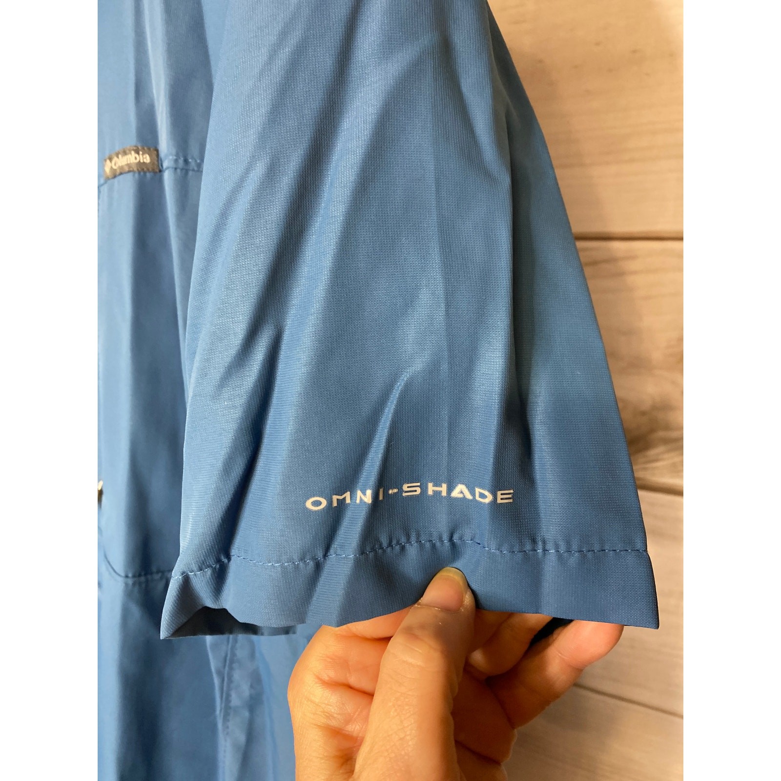 как выглядит Columbia Mens Size Medium Blue Nylon Omni Shade Short Sleeve Button Down Shirt фото