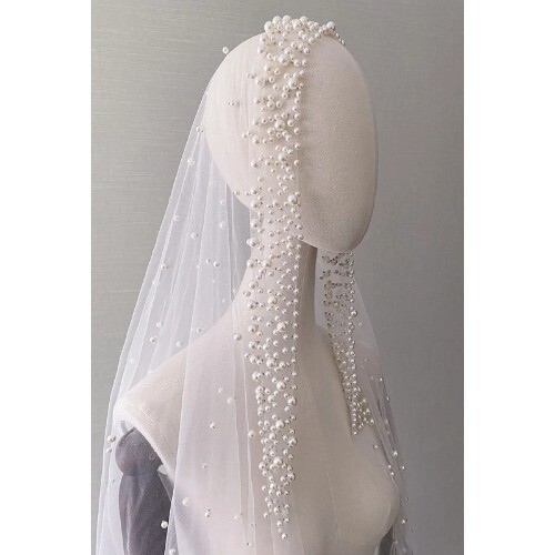 Romantic Trailing Cathedral Wedding Veil One-Layer Pearl Beading Headpiece