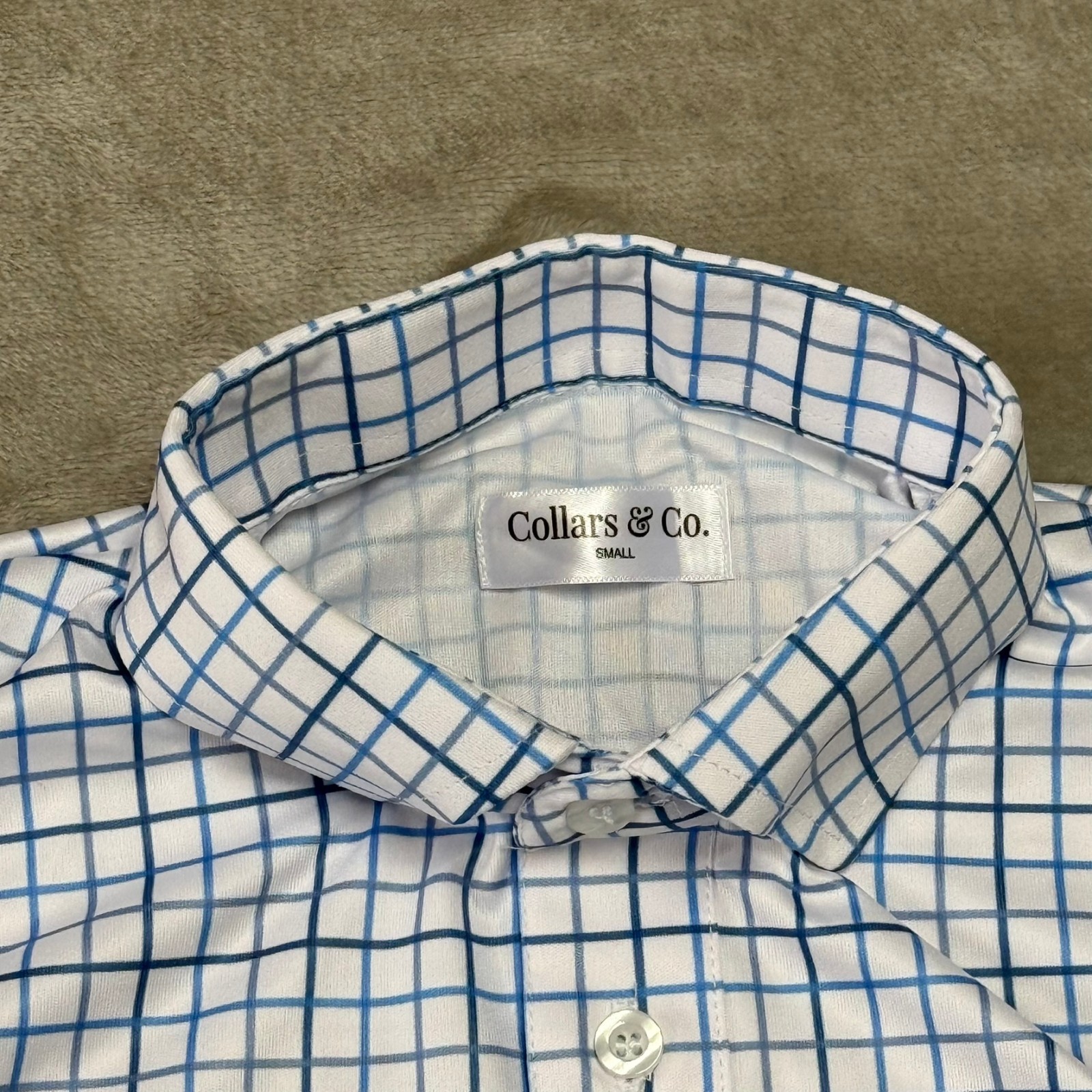 как выглядит Collars Co Dress Collar Polo Shirt Mens Small White Blue Check Soft New NWOT фото
